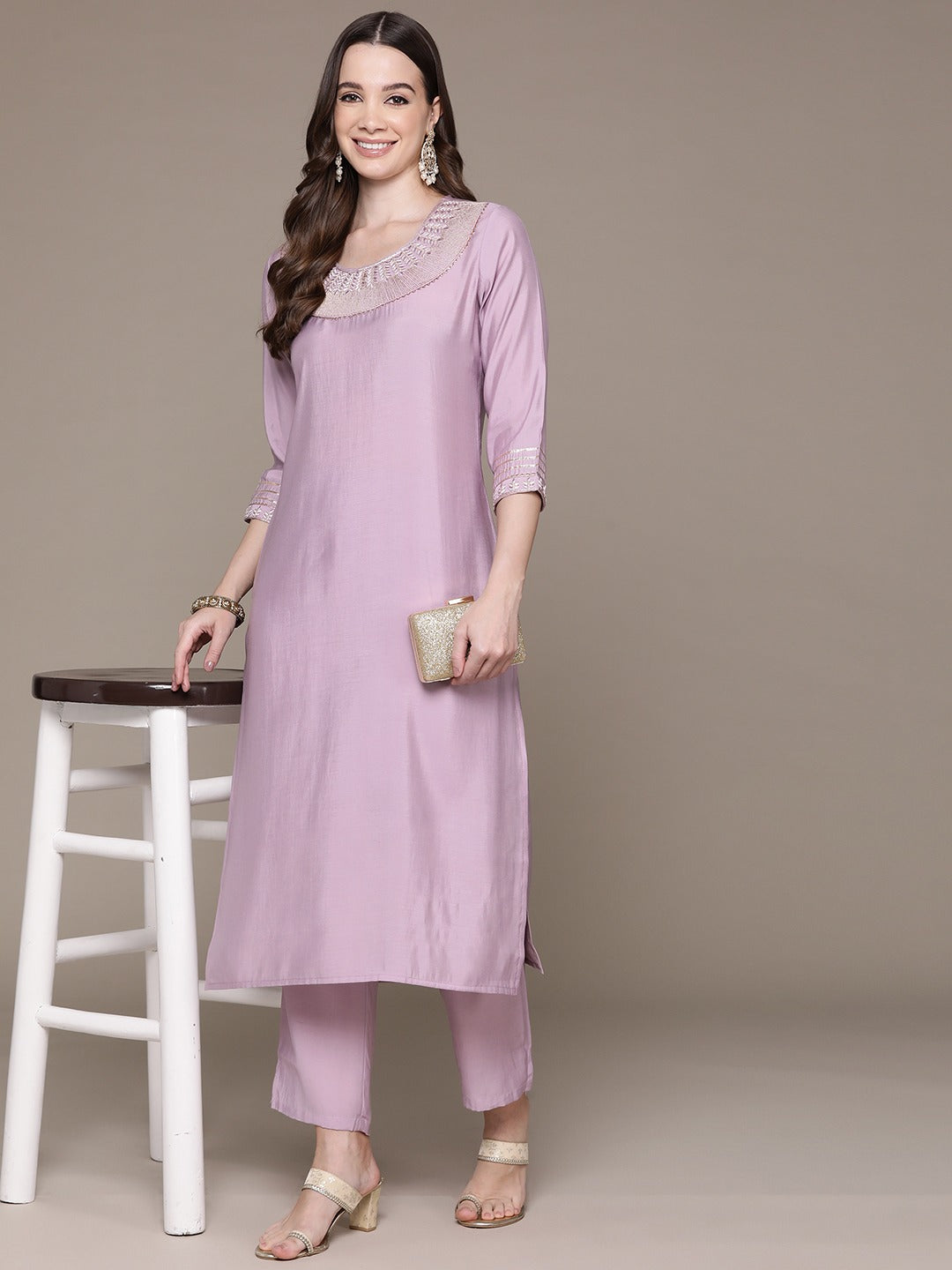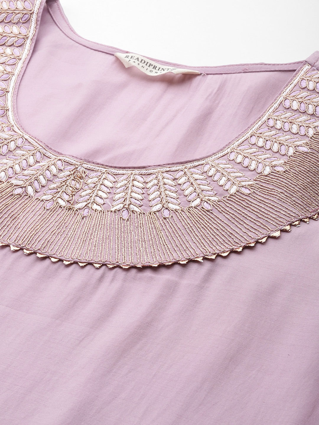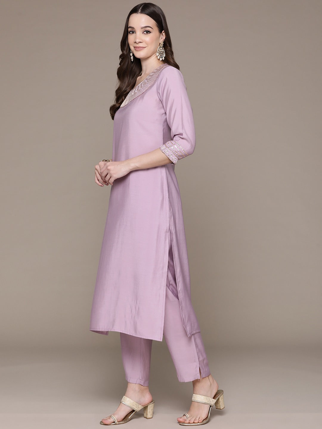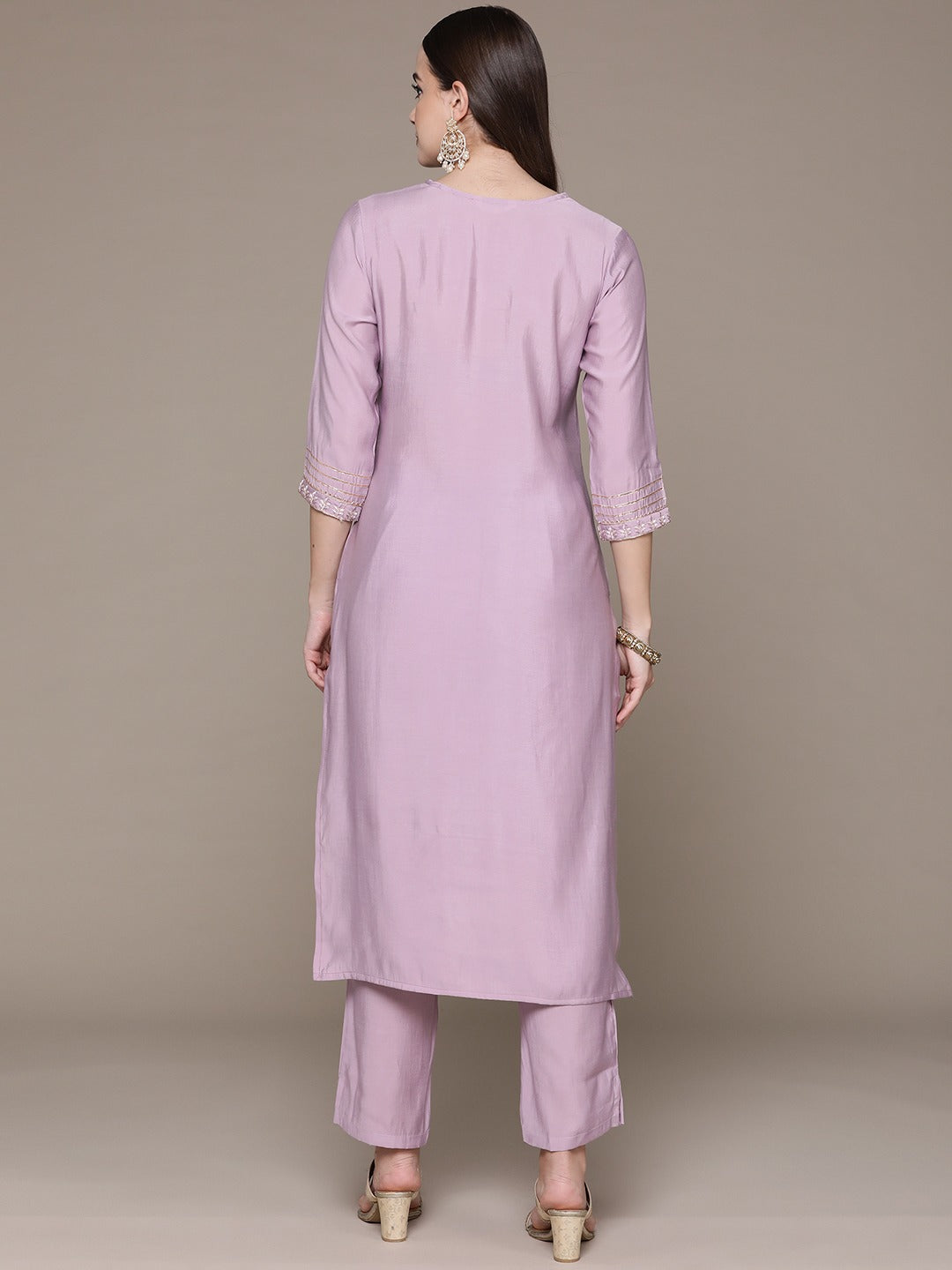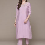 Straight Style Silk Fabric Violet Color Embroidered & Zari Work Kurti With Palazzo
