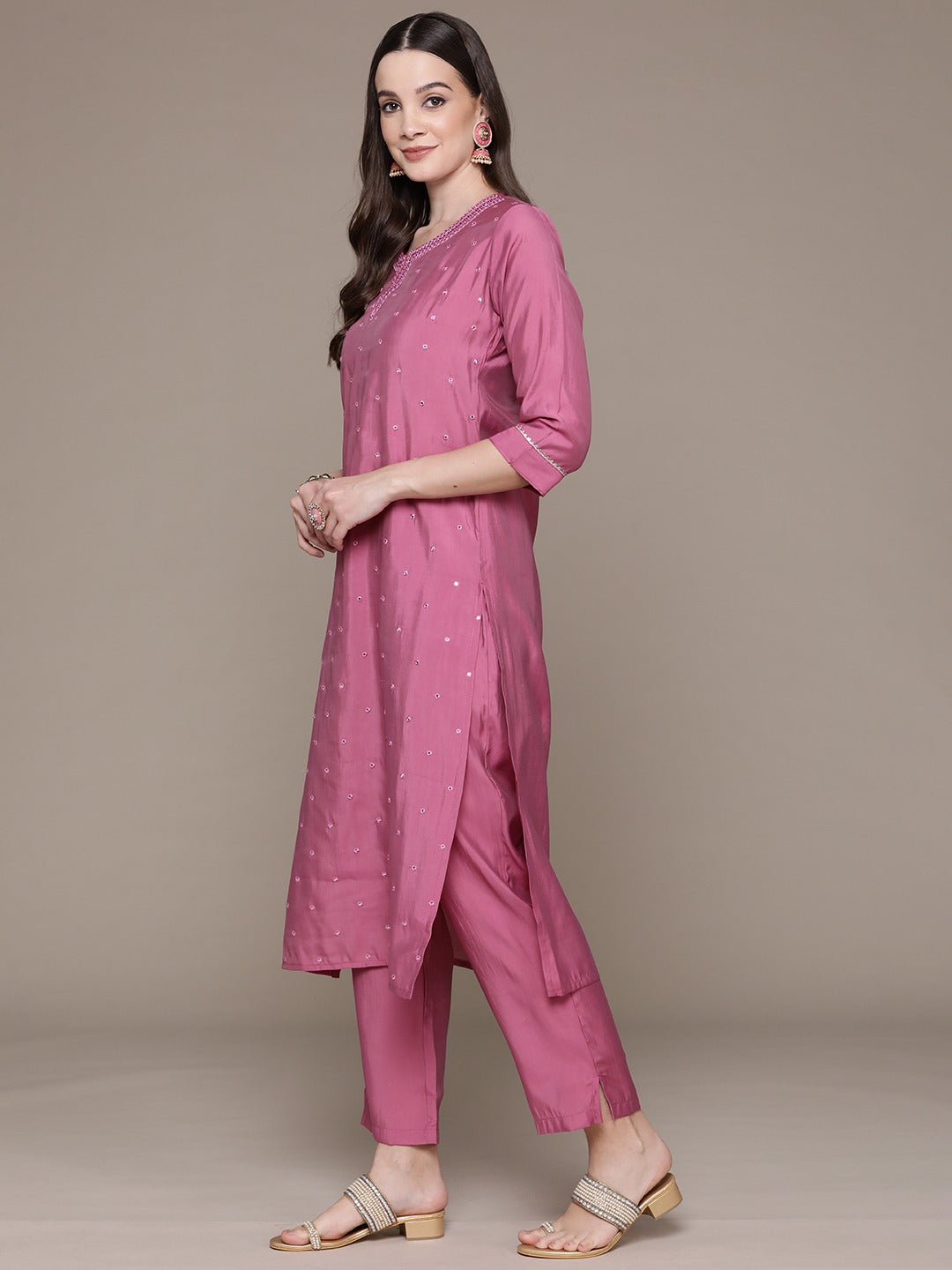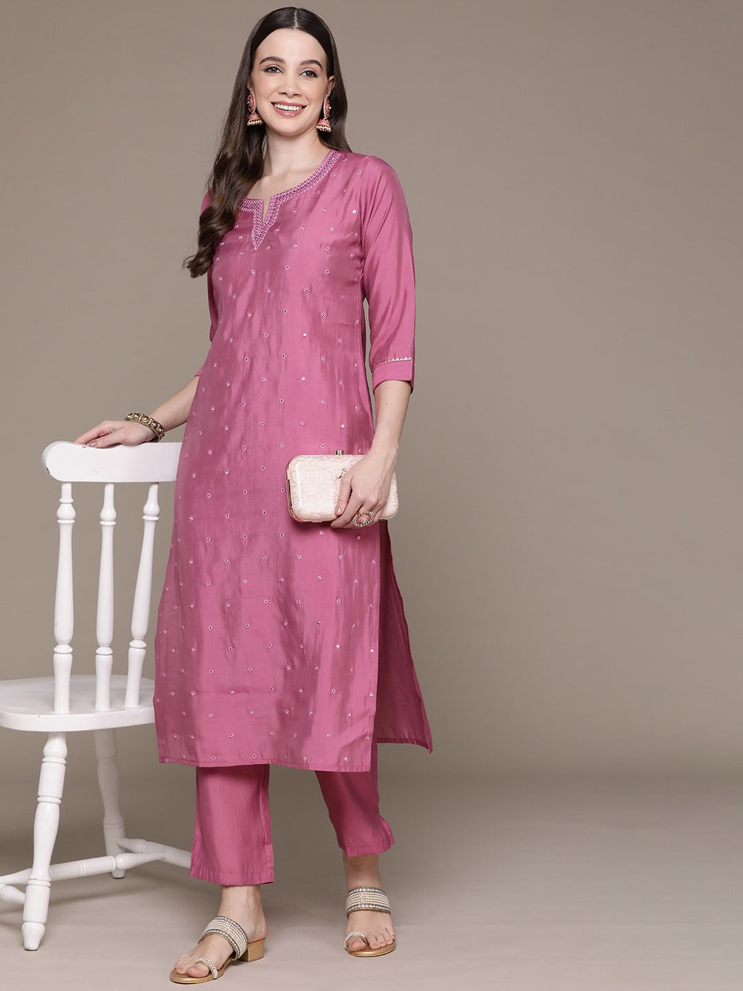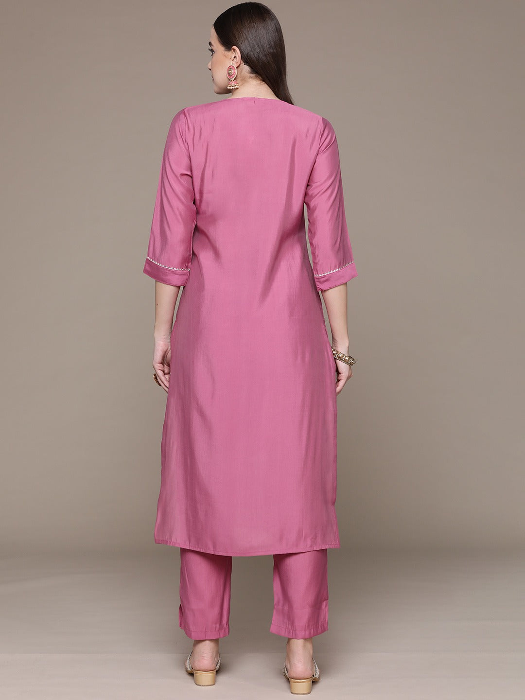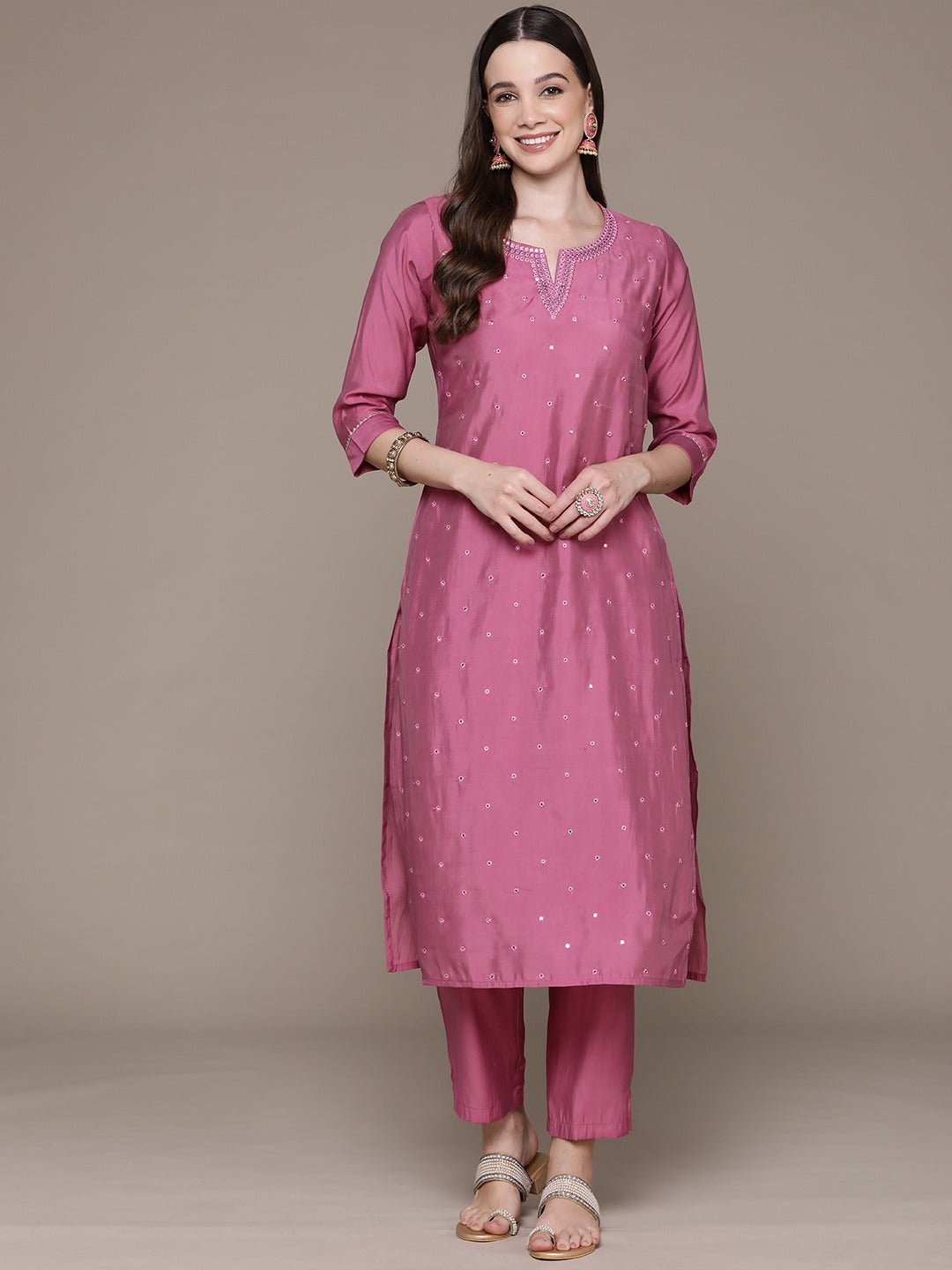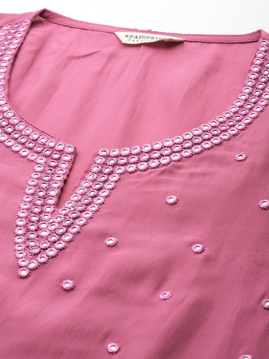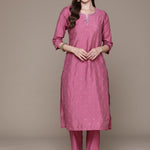 Straight Style Silk Fabric Pink Color Embroidered & Mirror Work Kurti With Palazzo