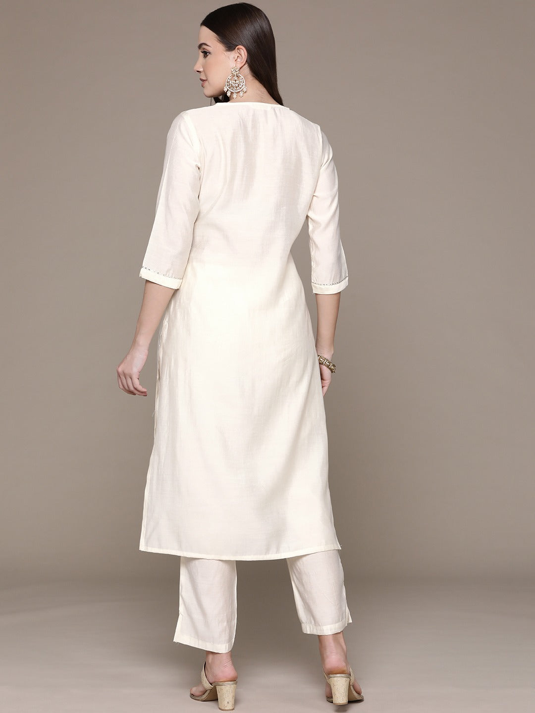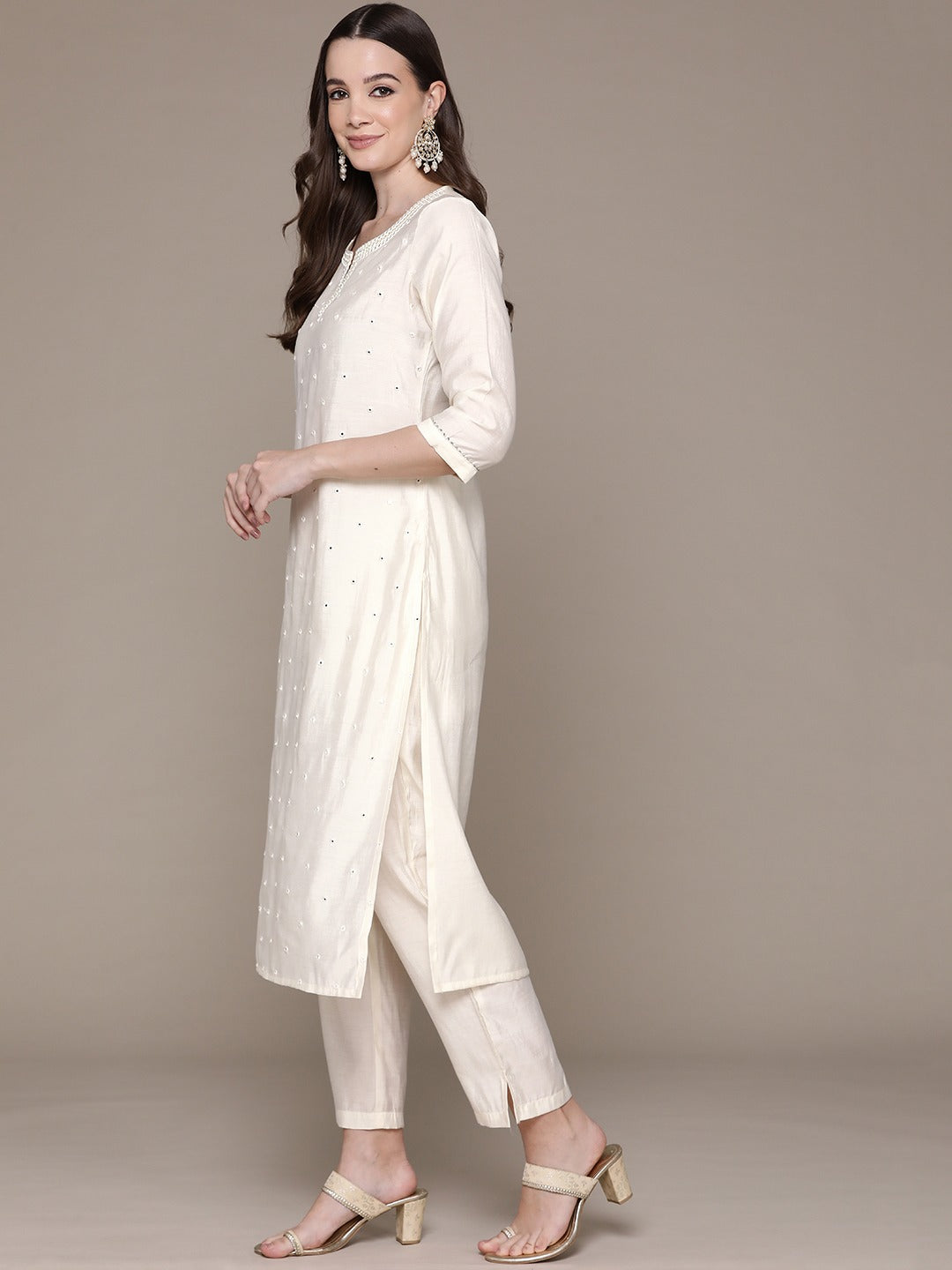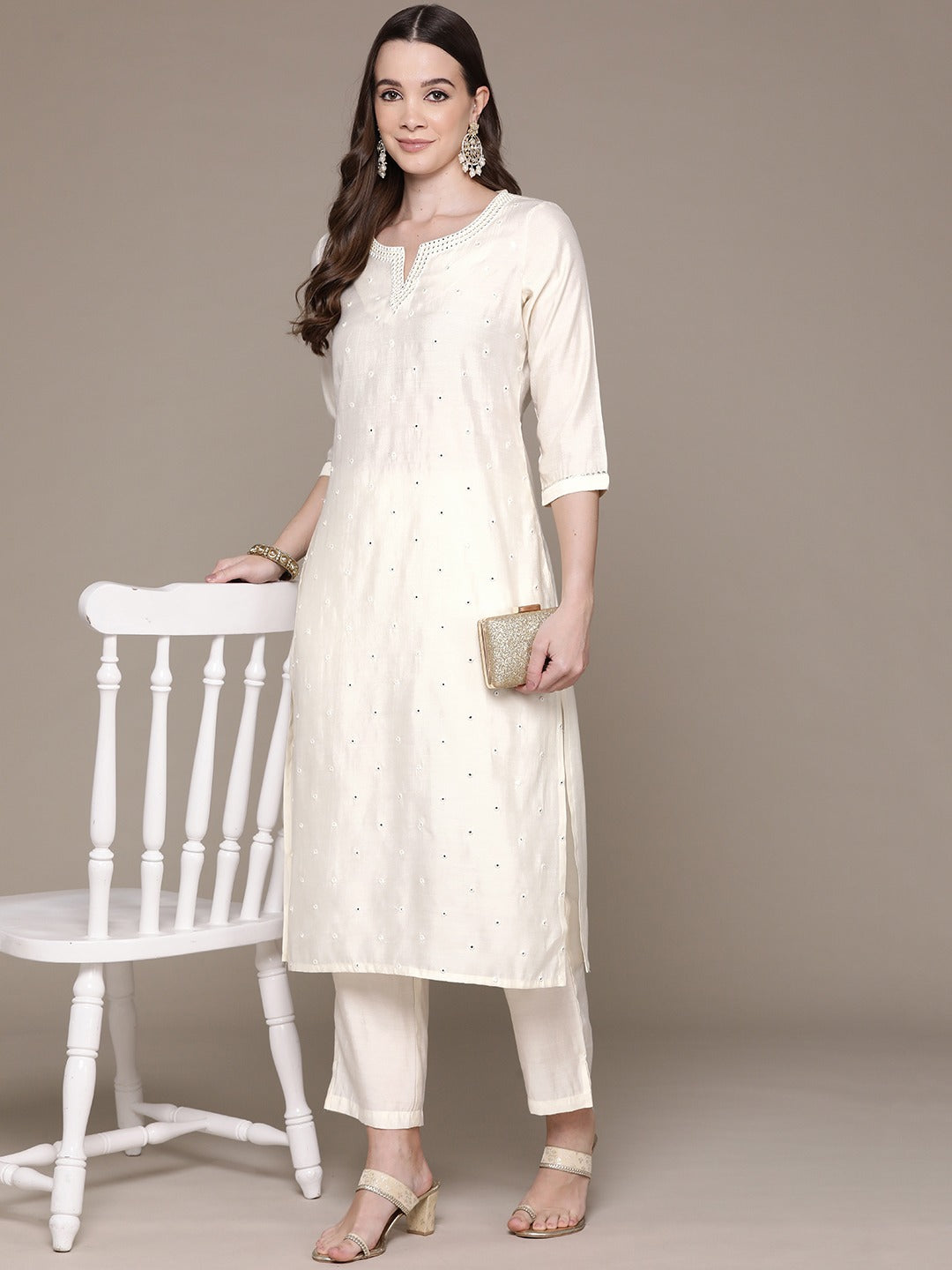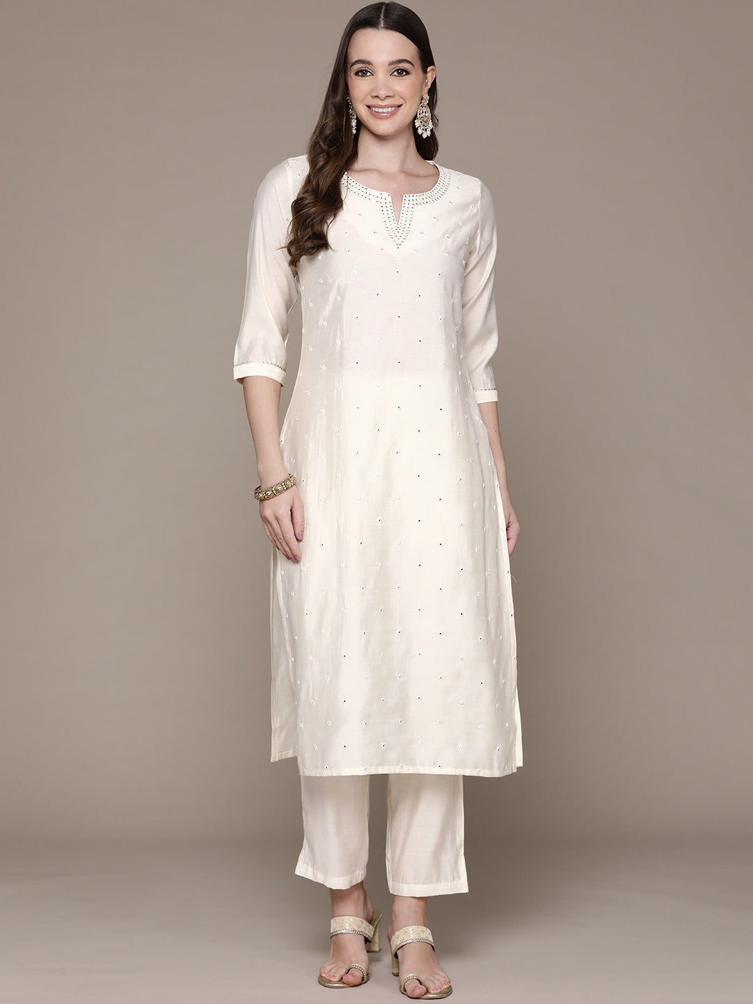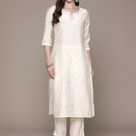 Straight Style Silk Fabric Cream Color Embroidered & Mirror Work Kurti With Palazzo
