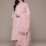 Straight Style Cotton Fabric Pink Color Floral Printed Kurti With Palazzo And Dupatta
