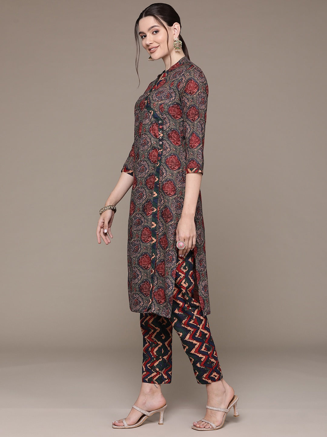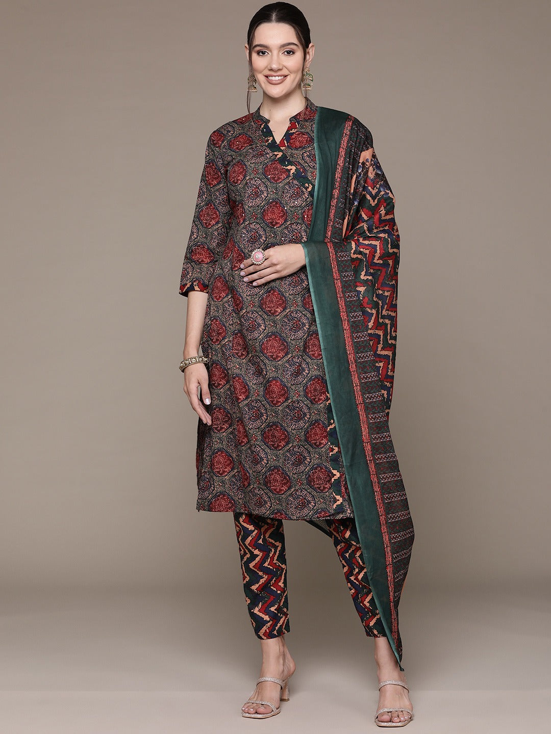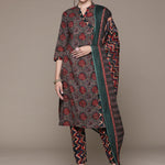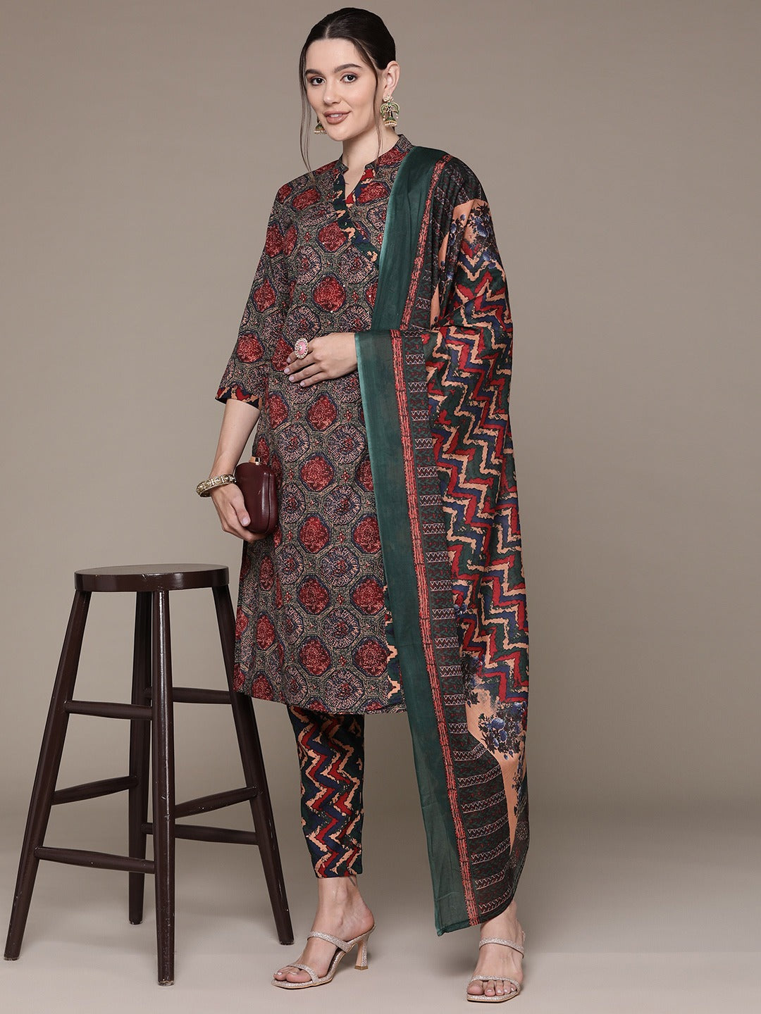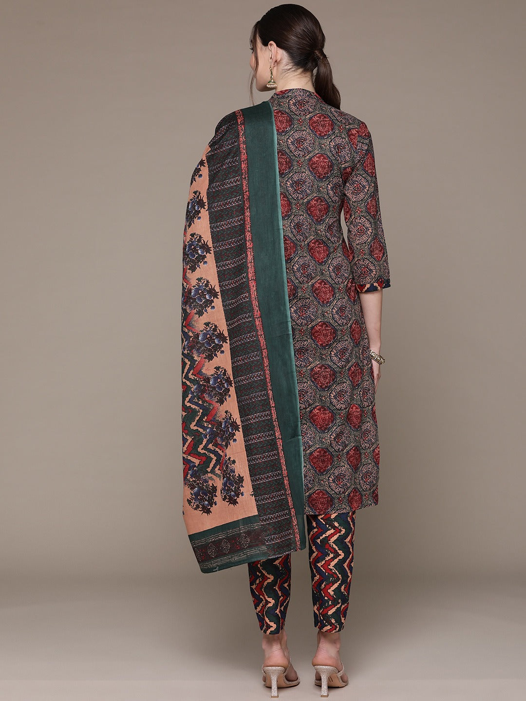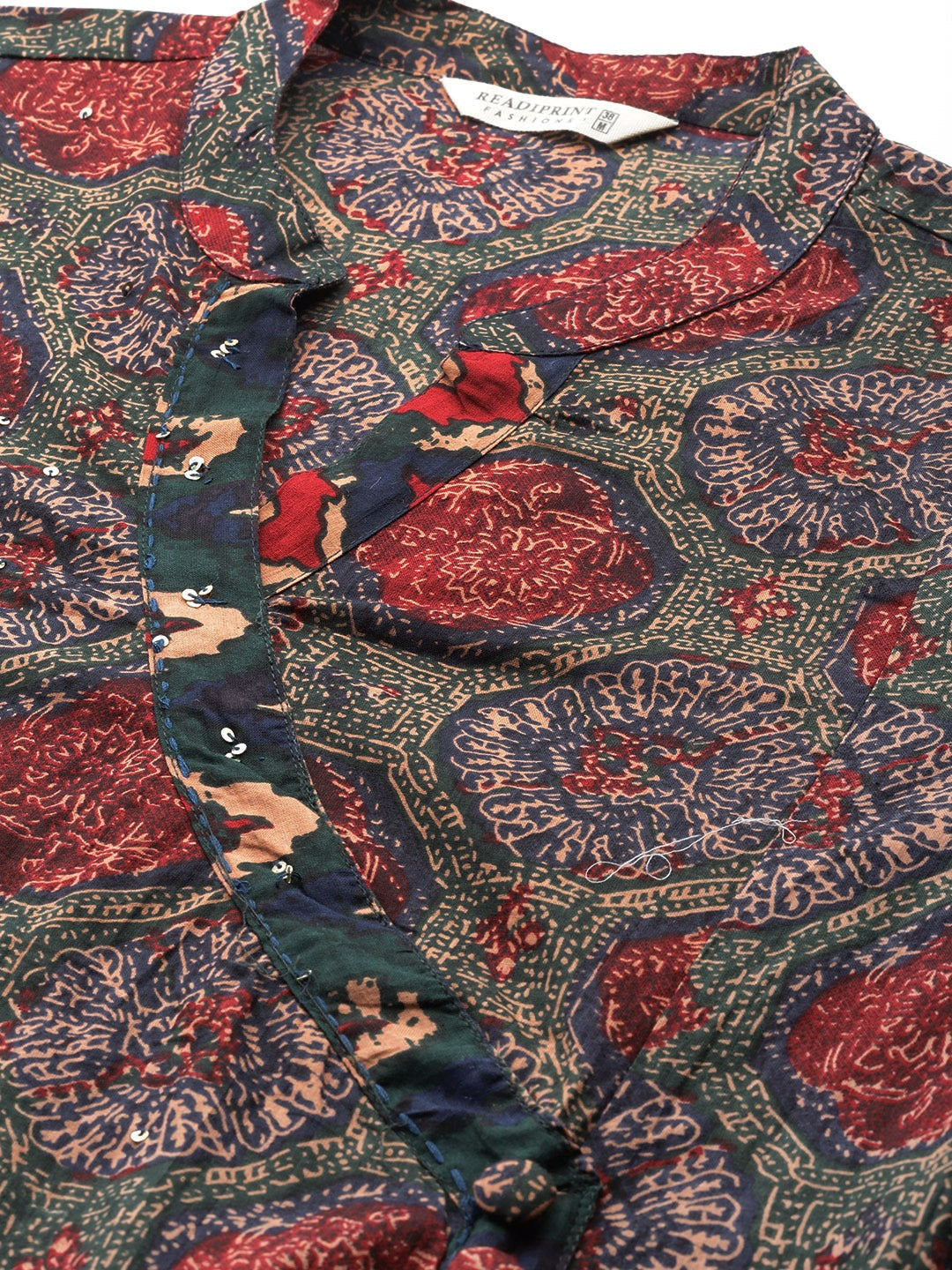 Straight Style Cotton Fabric Green Color Printed Kurti With Palazzo And Dupatta