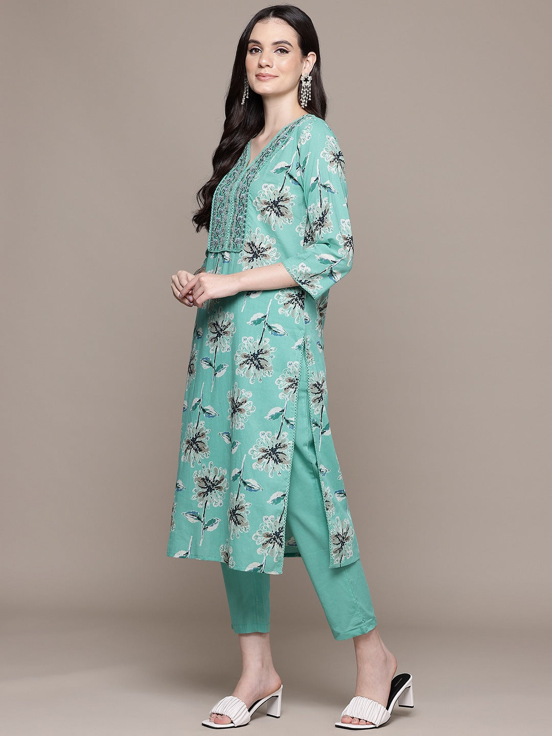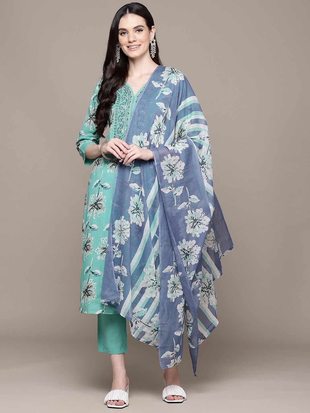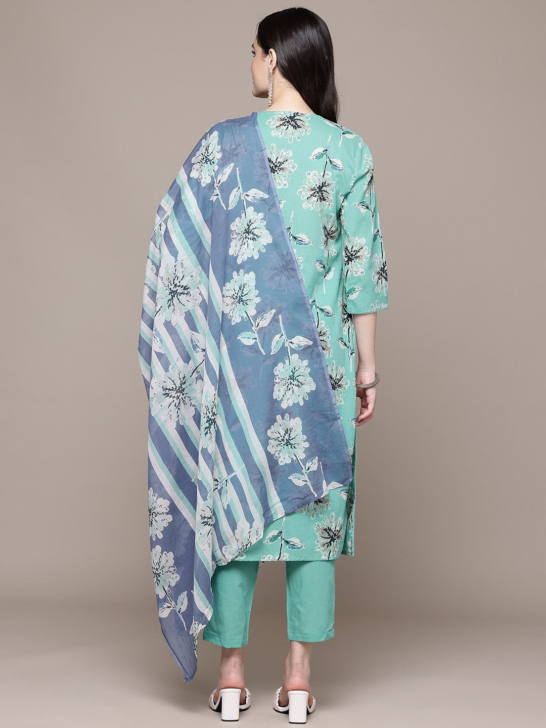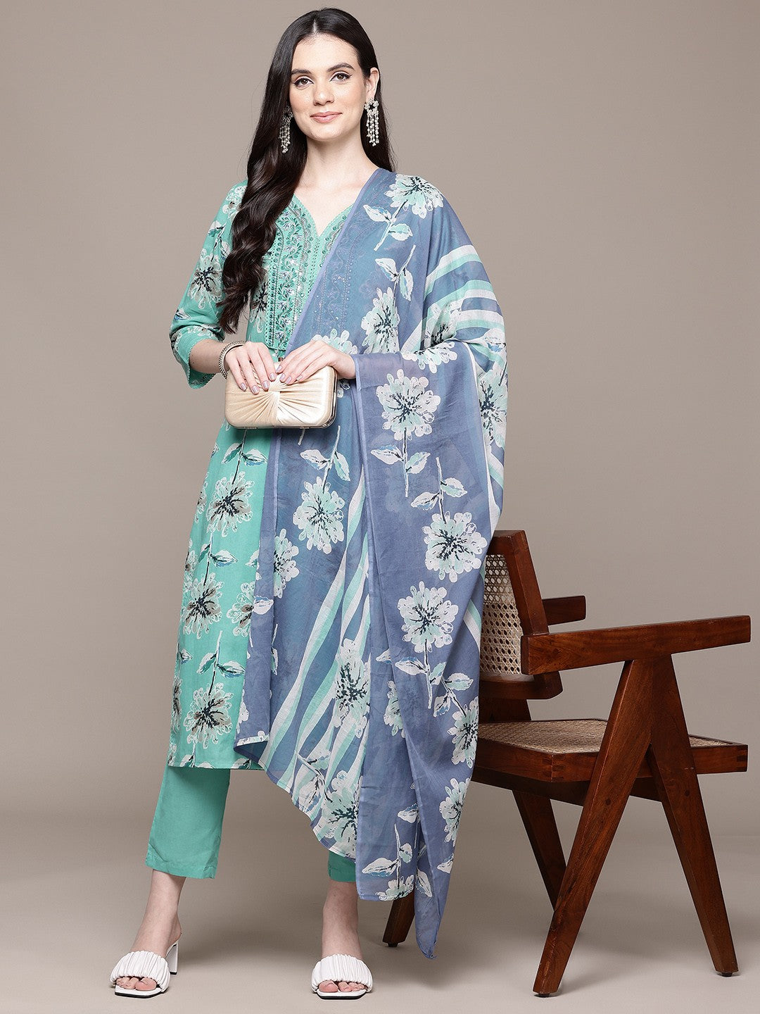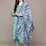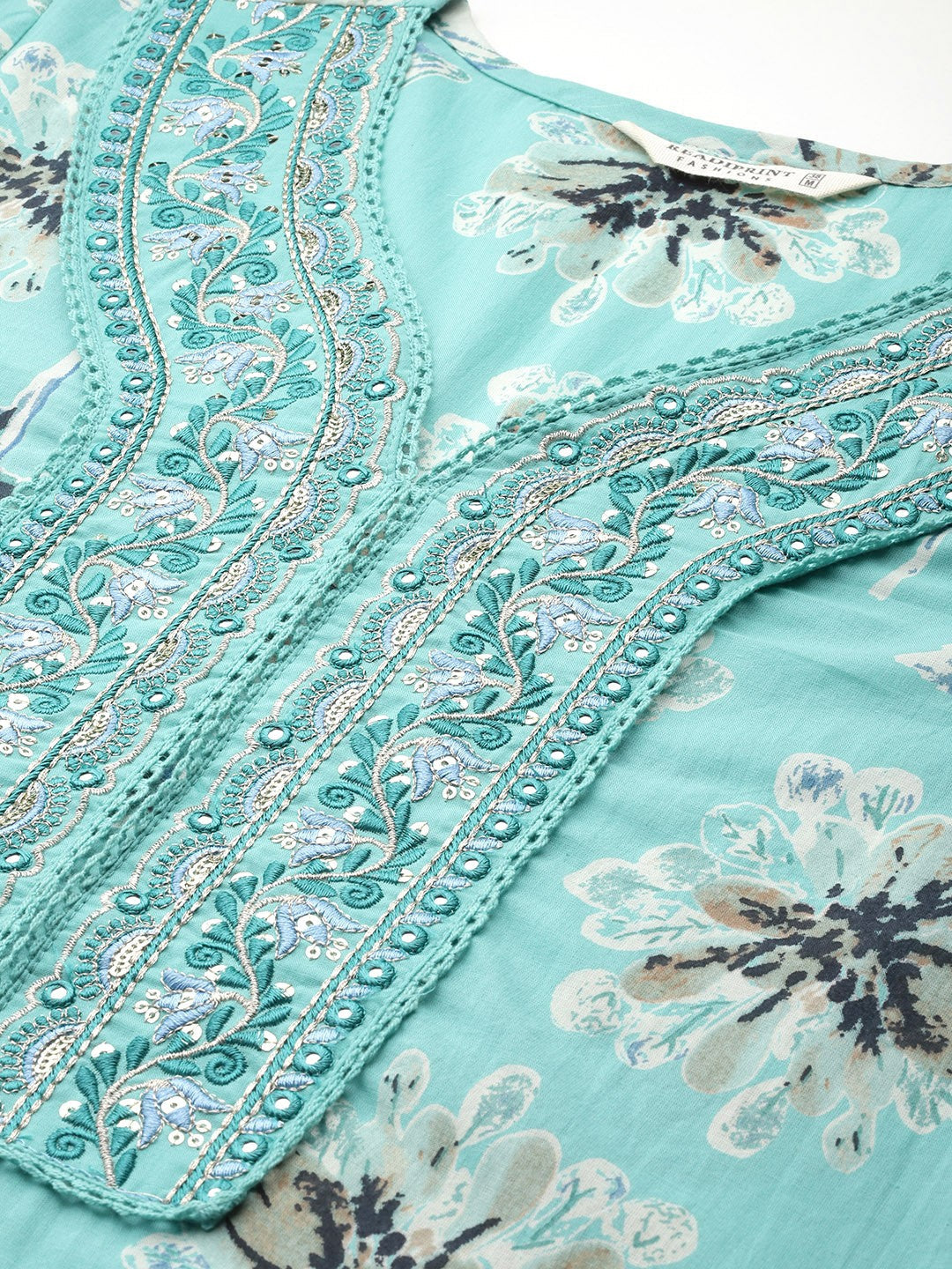 Straight Style Cotton Fabric Teal Color Floral Printed Kurti With Palazzo And Dupatta With Thread Work