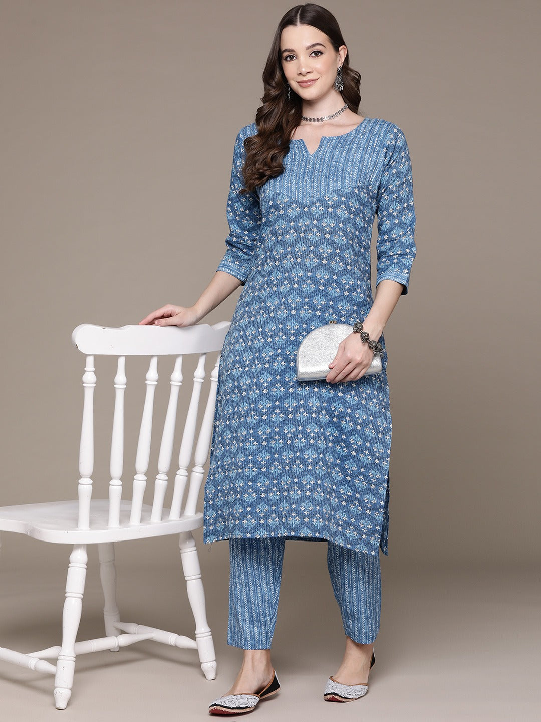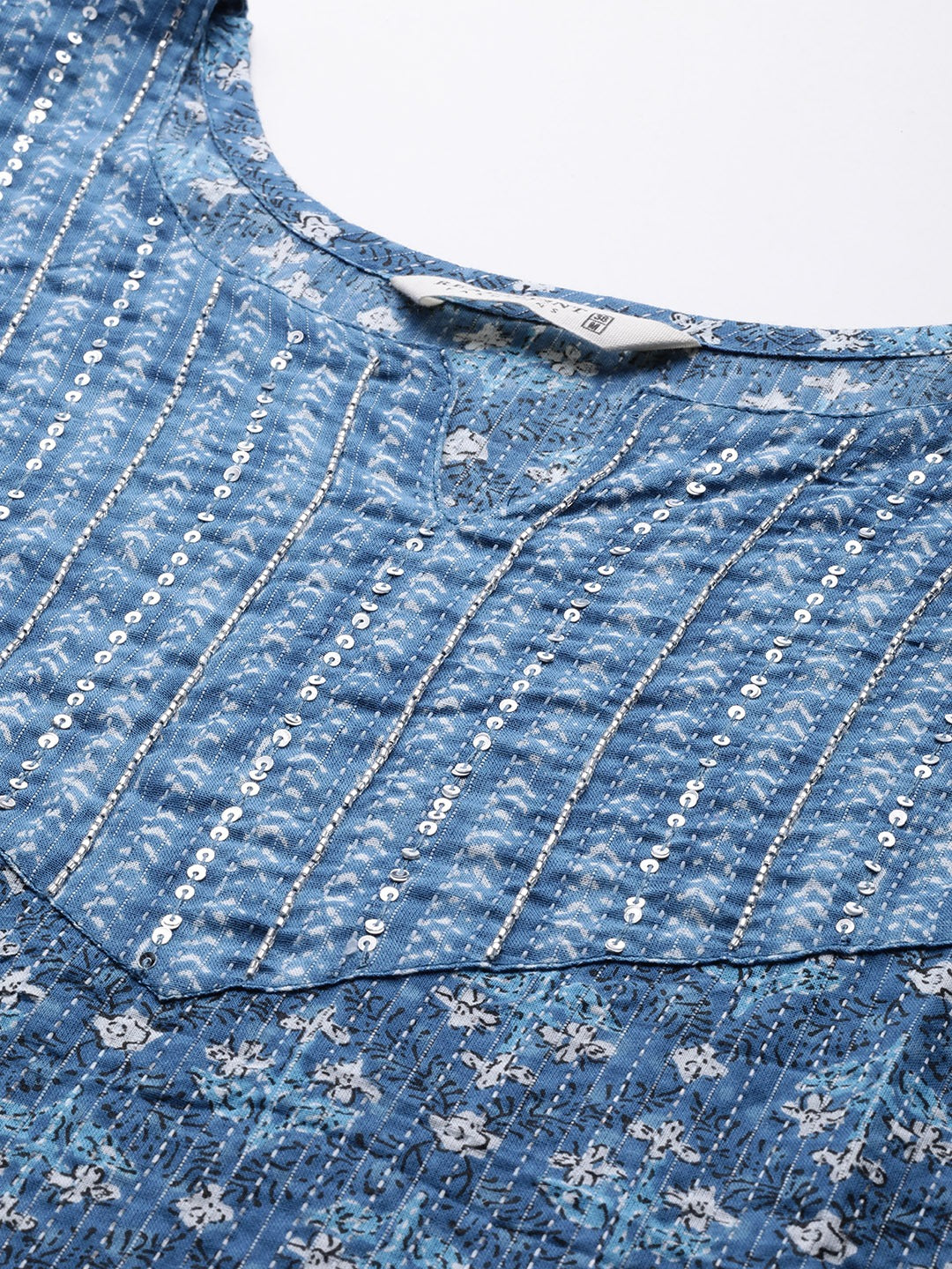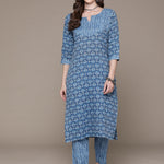 Straight Style Cotton Fabric Blue Color Floral Printed Beads Work Kurti With Palazzo