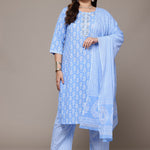 Straight Style Cotton Fabric Blue Colour Kurta With Bottom And Dupatta