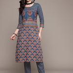 Straight Style Cotton Fabric Blue Color Kurta And Bottom