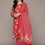 Straight Style Cotton Fabric Red Color Kurta And Bottom With Dupatta