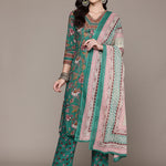Straight Style Cotton Fabric Sea Green Color Kurta And Bottom With Dupatta