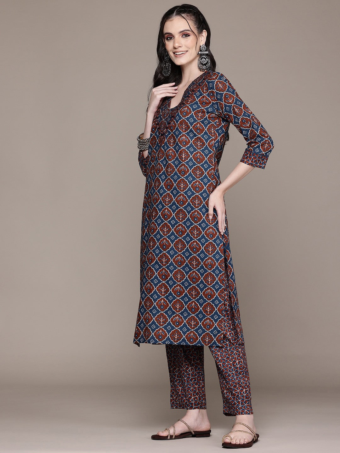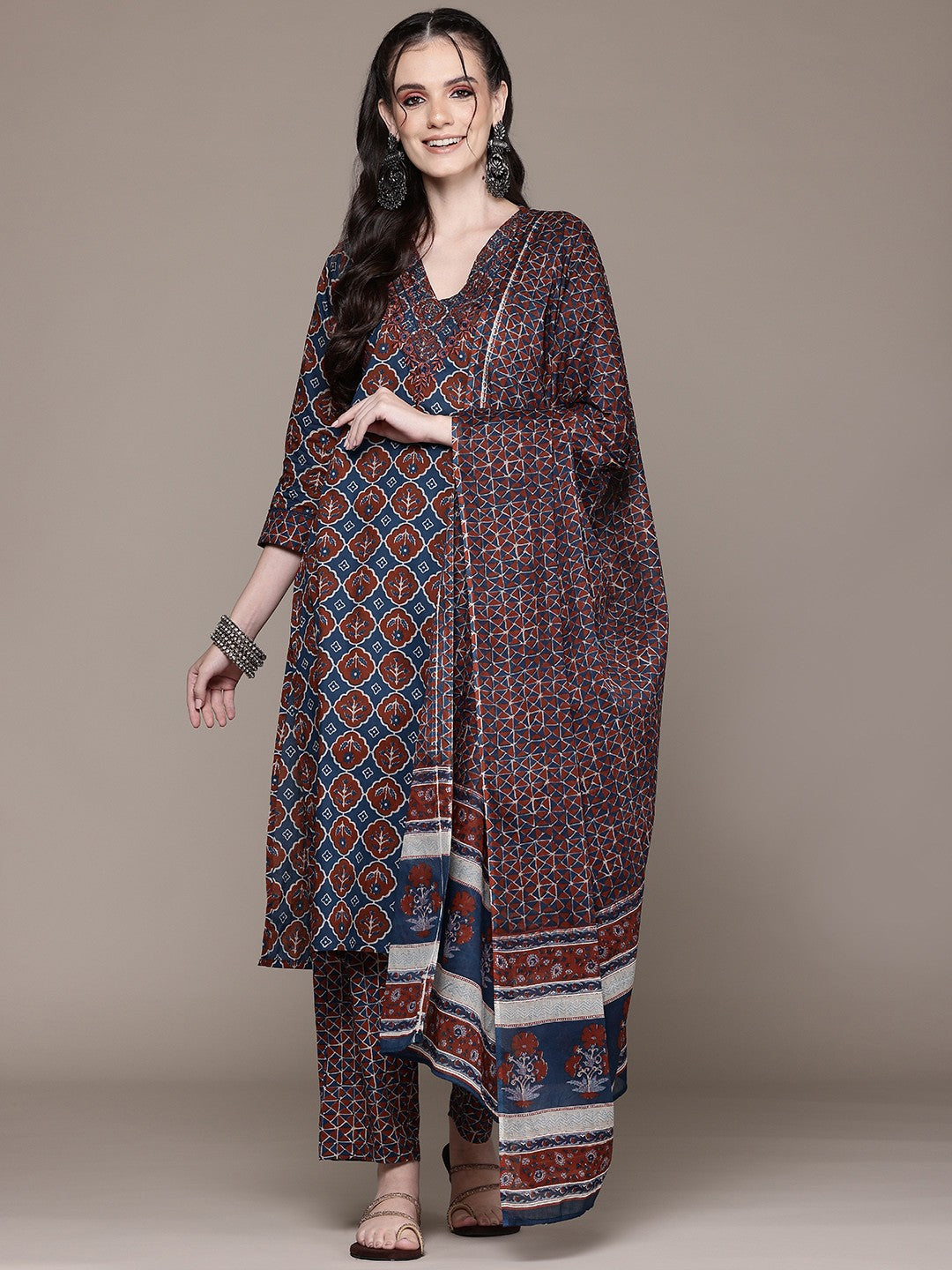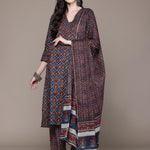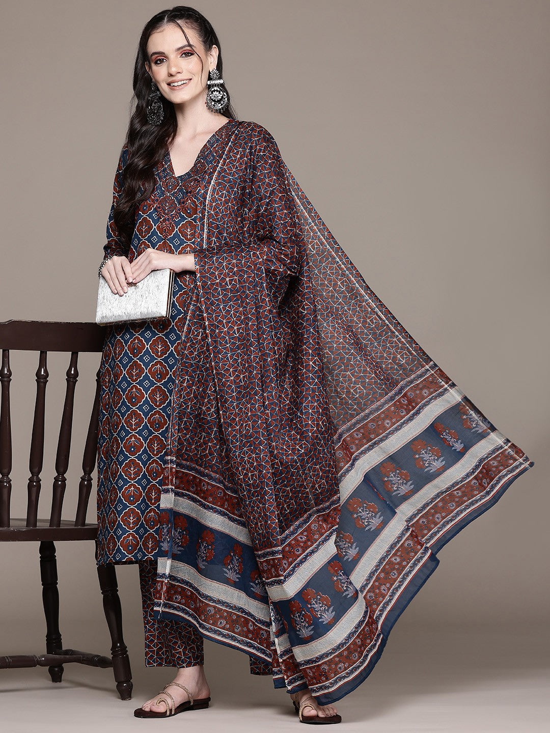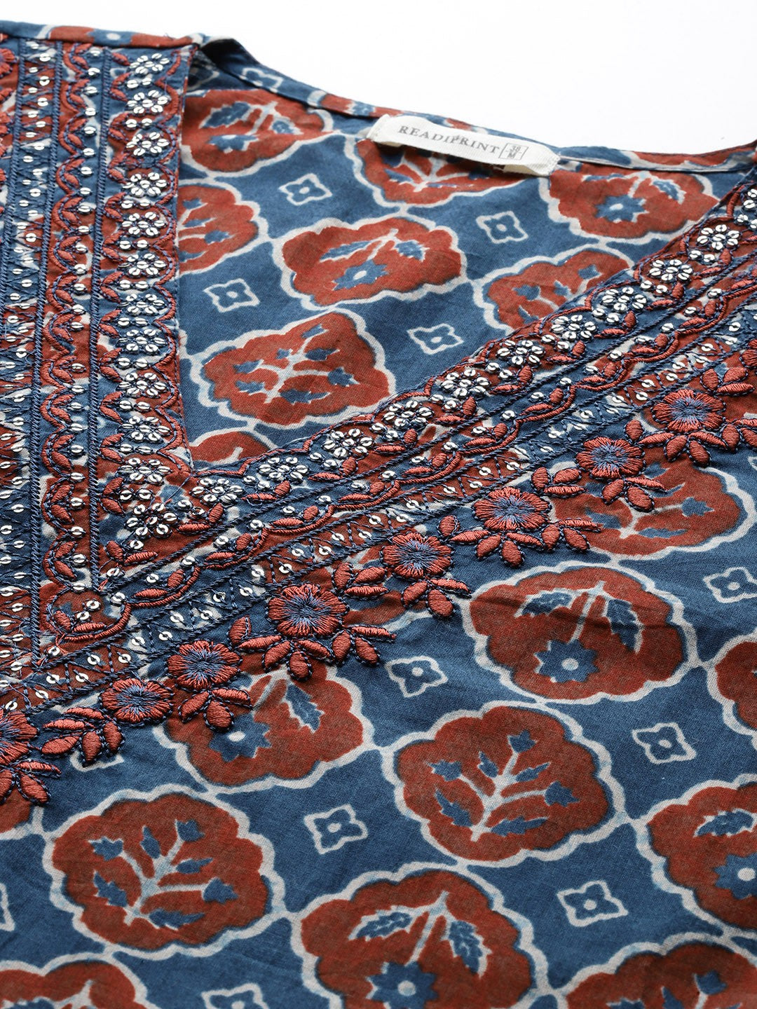 Straight Style Cotton Fabric Navy Blue Color Kurta And Bottom With Dupatta