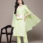 Straight Style Cotton Fabric Green Color Kurta With Bottom And Dupatta