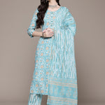 Straight Style Cotton Fabric Turquoise Blue Color Kurta And Bottom With Dupatta