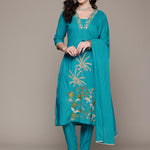 Straight Style Cotton Fabric Turquoise Blue Color Kurta And Bottom With Dupatta