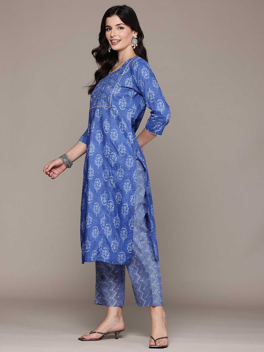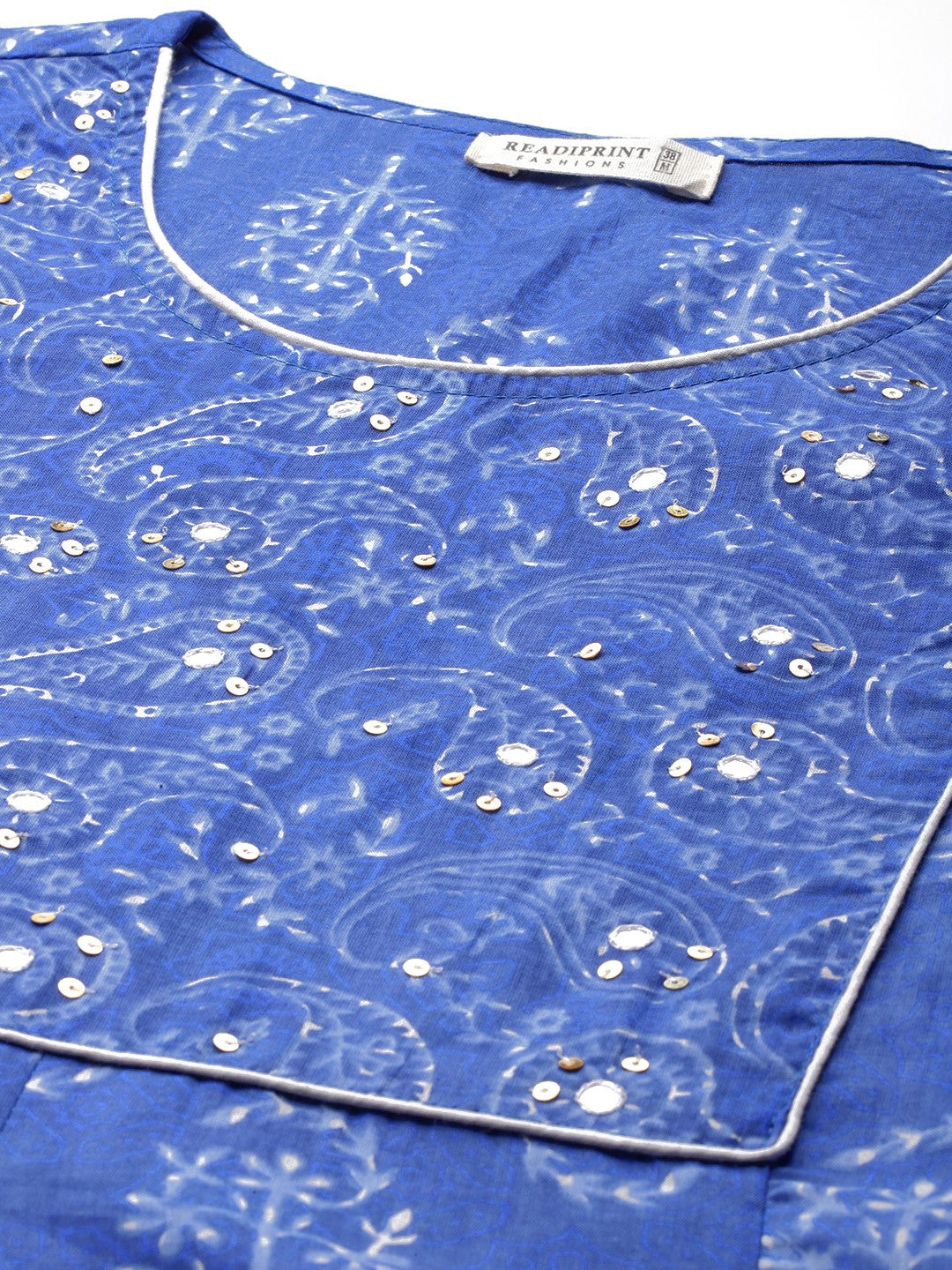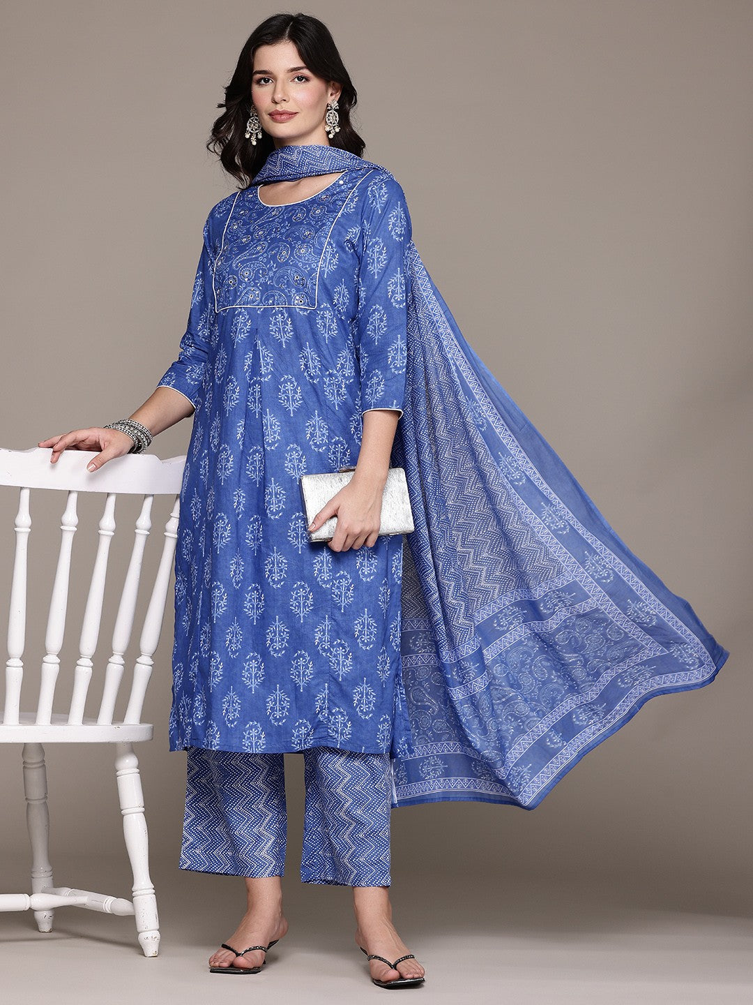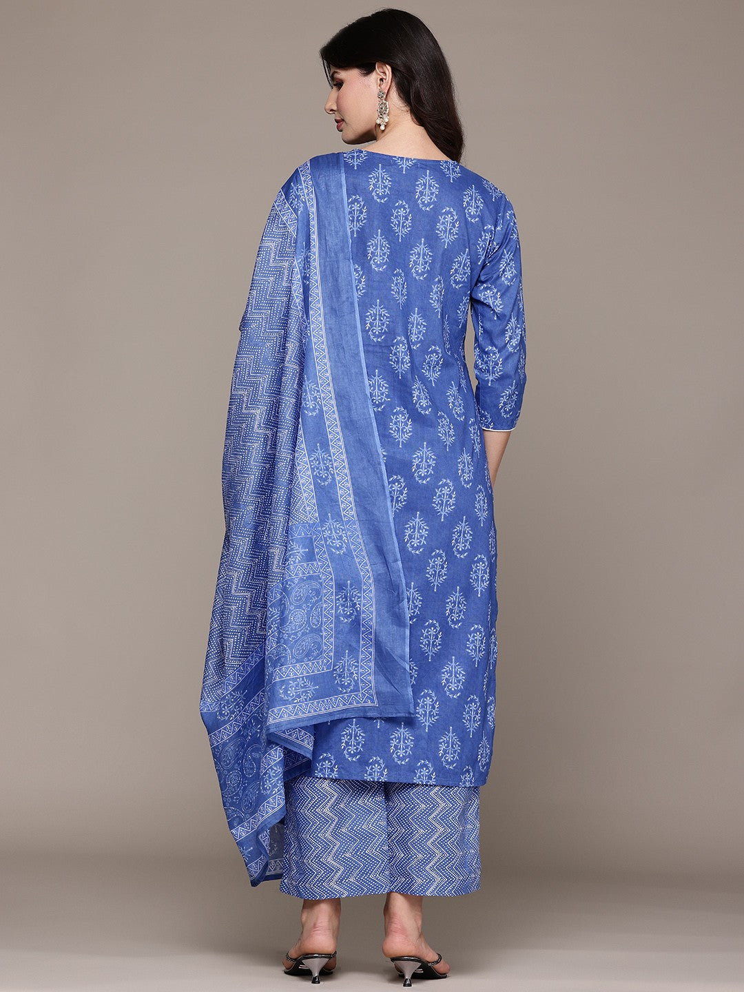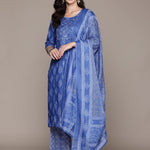 Straight Style Cotton Fabric Blue Color Kurta And Bottom With Dupatta