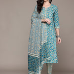 Straight Style Cotton Fabric Turquoise Blue Color Kurta And Bottom With Dupatta