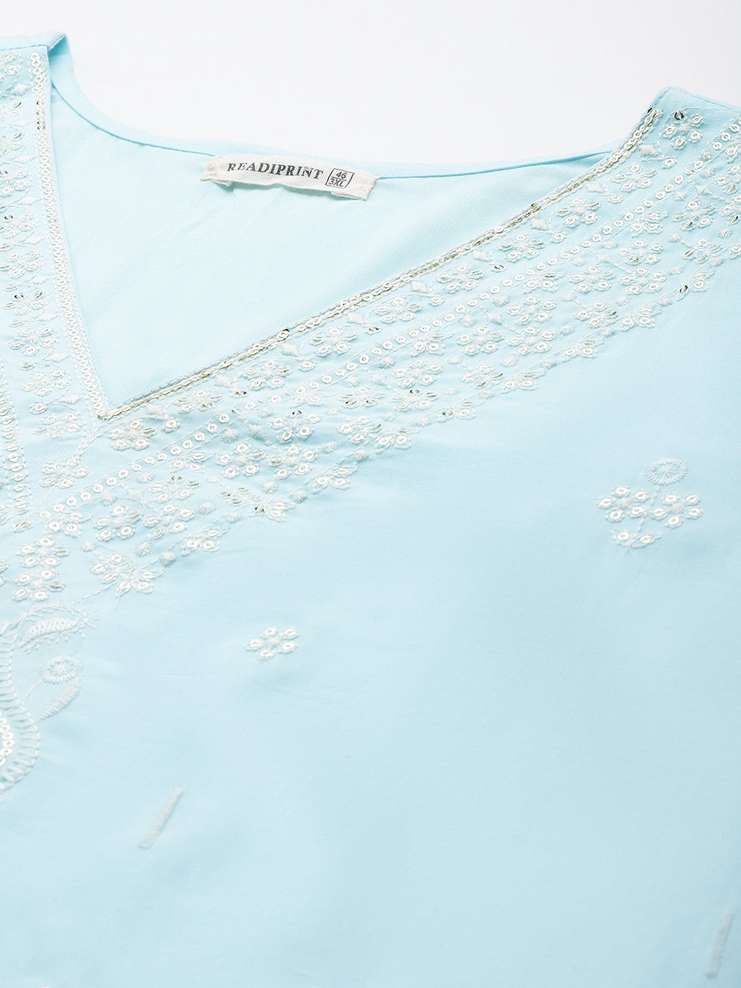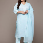 Straight Style Cotton Fabric Blue Color Kurta With Bottom And Dupatta