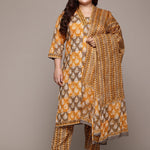 Straight Style Cotton Fabric Mustard Color Kurta With Bottom & Dupatta