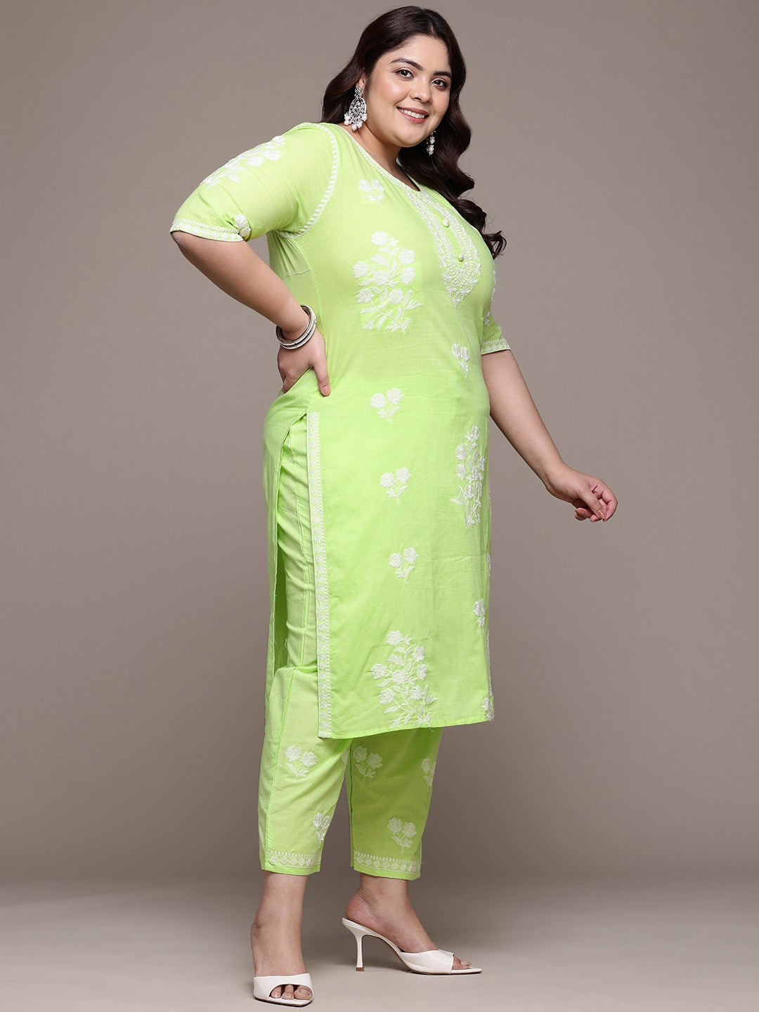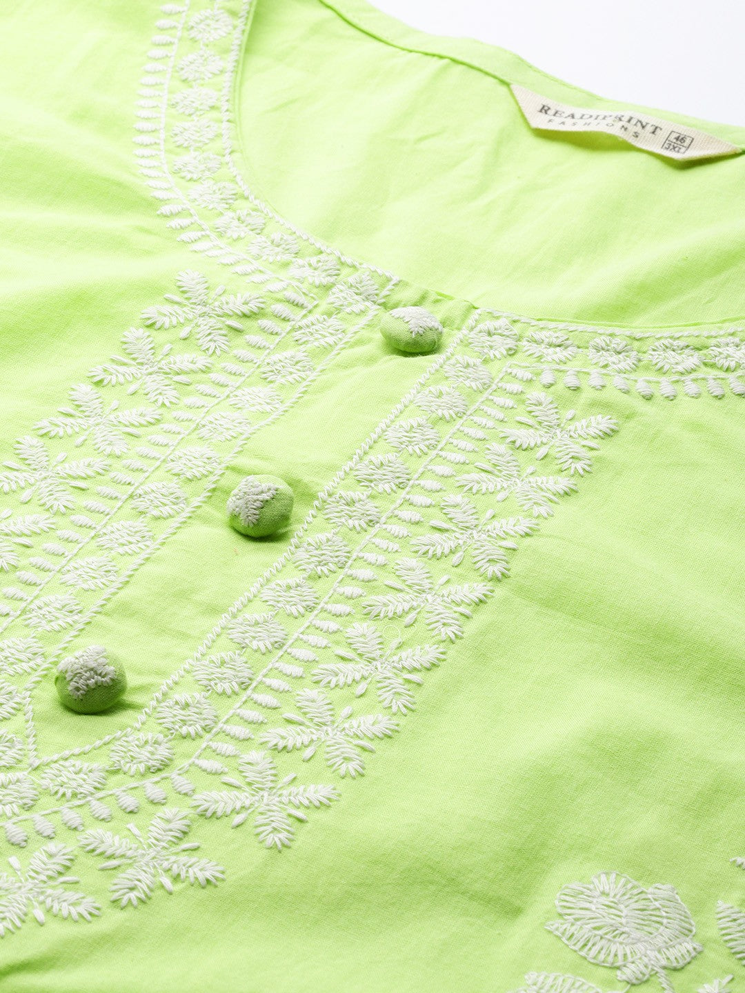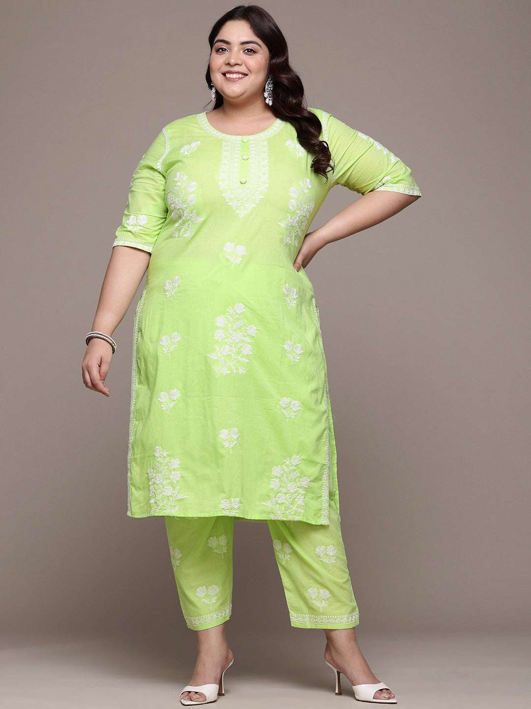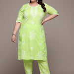 Straight Style Cotton Fabric Green Color Kurta With Bottom