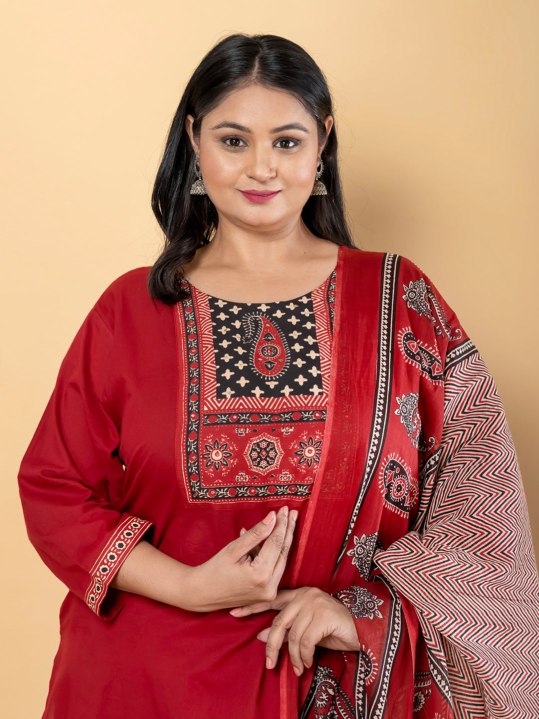 Straight Style Cotton Fabric Maroon Color Kurta And Bottom With Dupatta