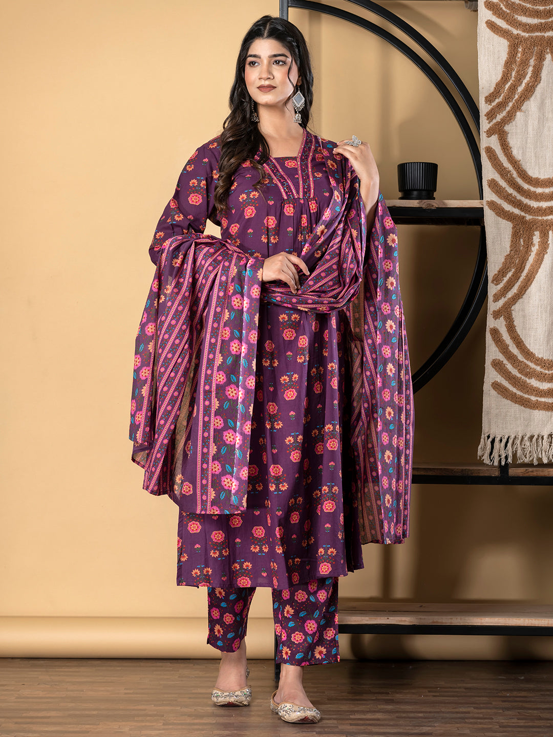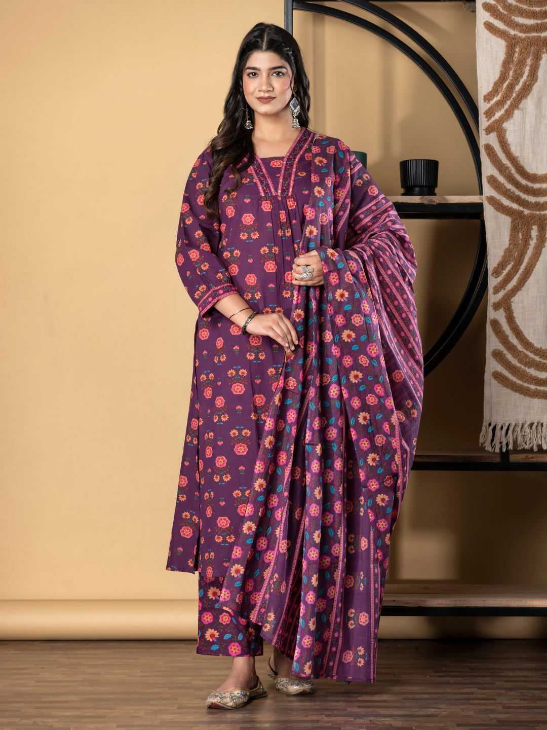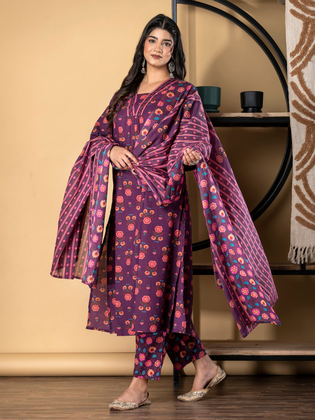 Straight Style Cotton Fabric Magenta Color Kurta And Bottom With Dupatta
