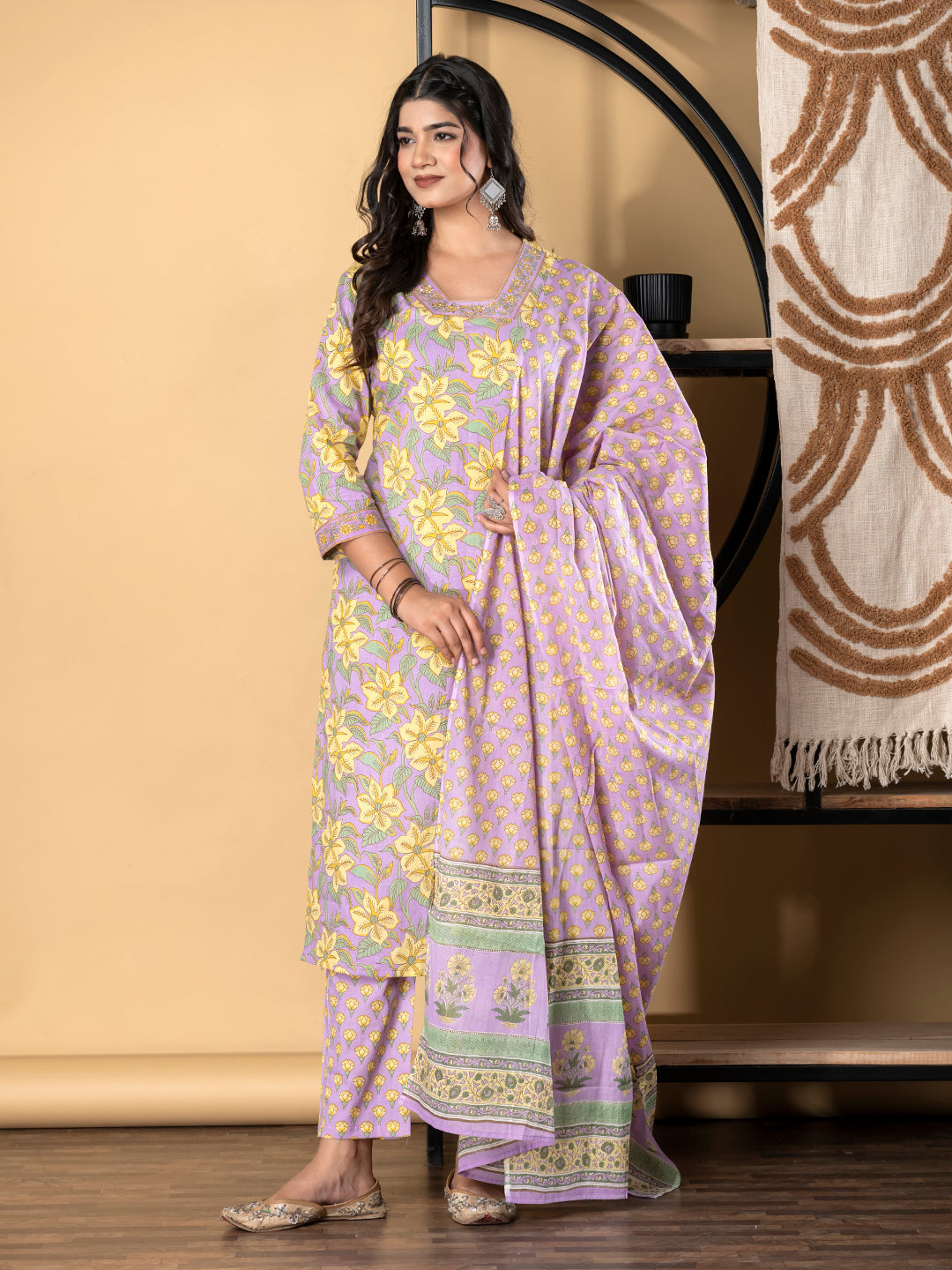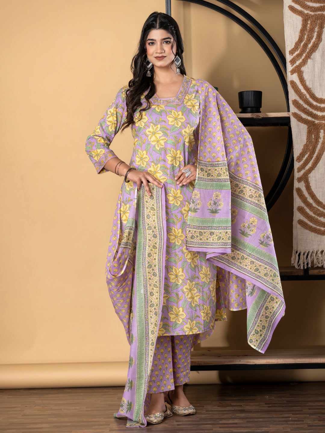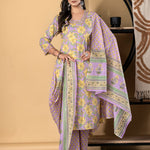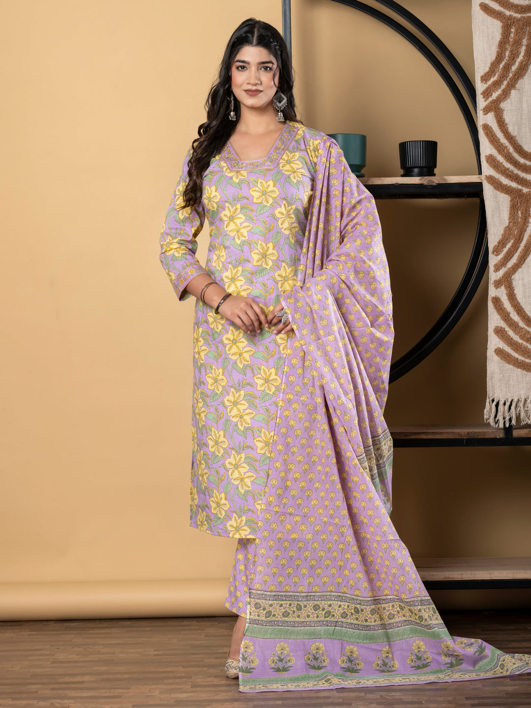 Straight Style Cotton Fabric Violet Color Kurta And Bottom With Dupatta