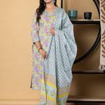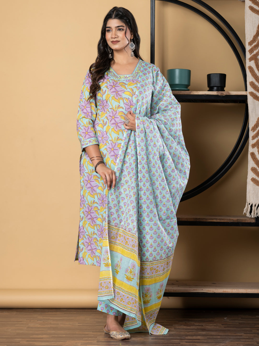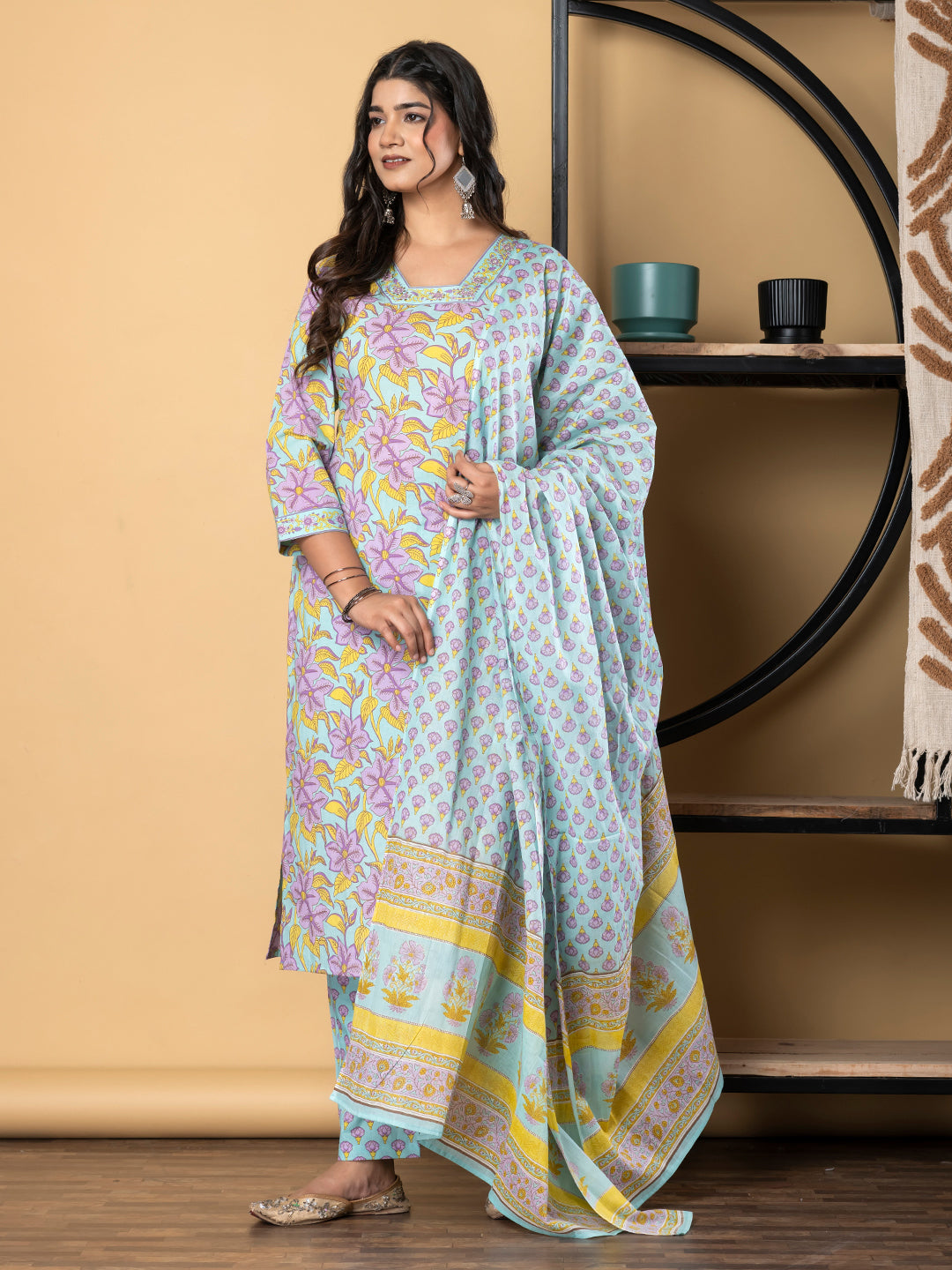 Straight Style Cotton Fabric Sea Green Color Kurta And Bottom With Dupatta