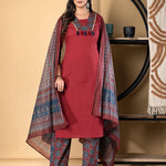 Straight Style Cotton Fabric Maroon Color Kurta And Bottom With Dupatta
