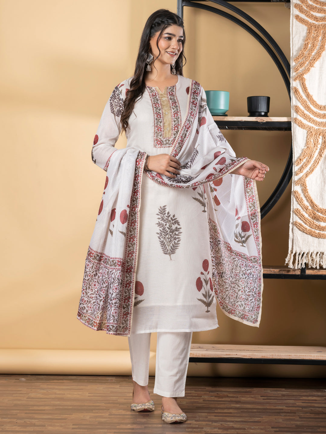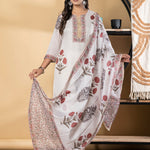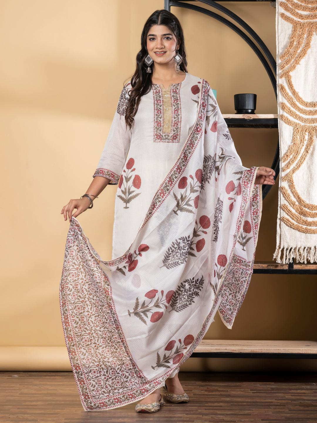 Straight Style Kota Doria Fabric Off White Color Kurta And Bottom With Dupatta