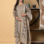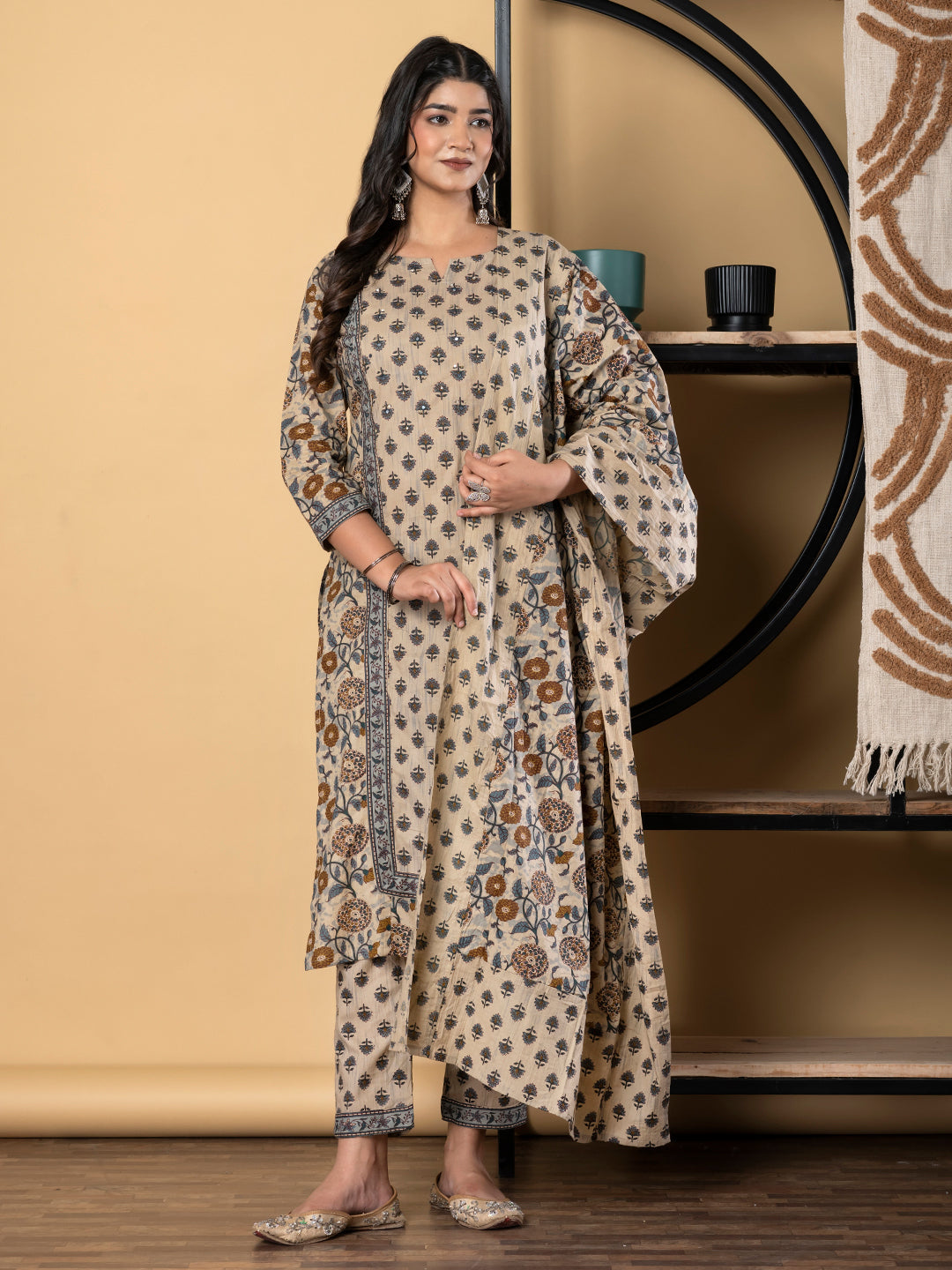 Straight Style Cotton Fabric Beige Color Kurta And Bottom With Dupatta