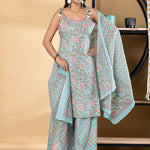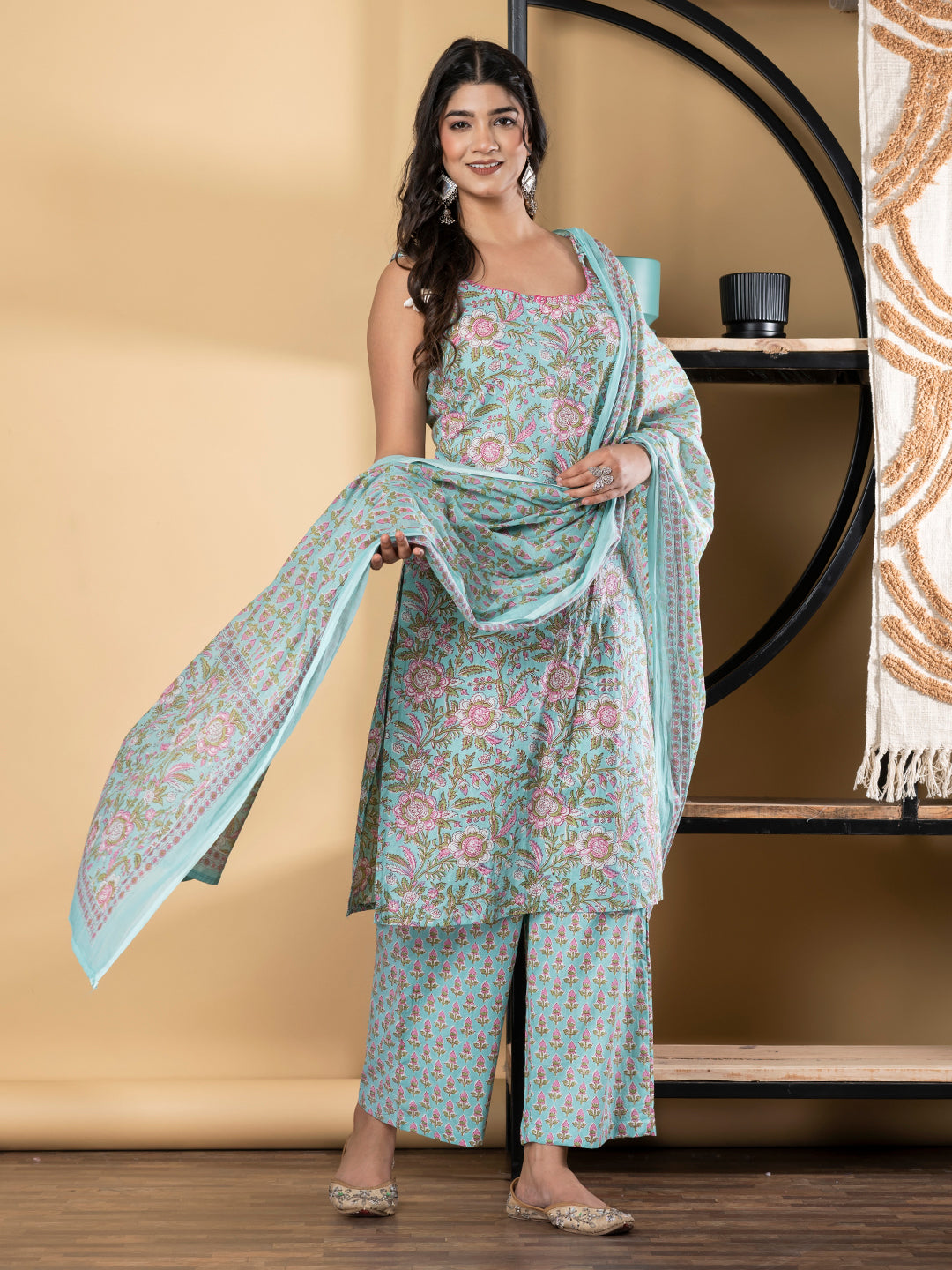 Straight Style Cotton Fabric Turquoise Blue Color Kurta And Bottom With Dupatta