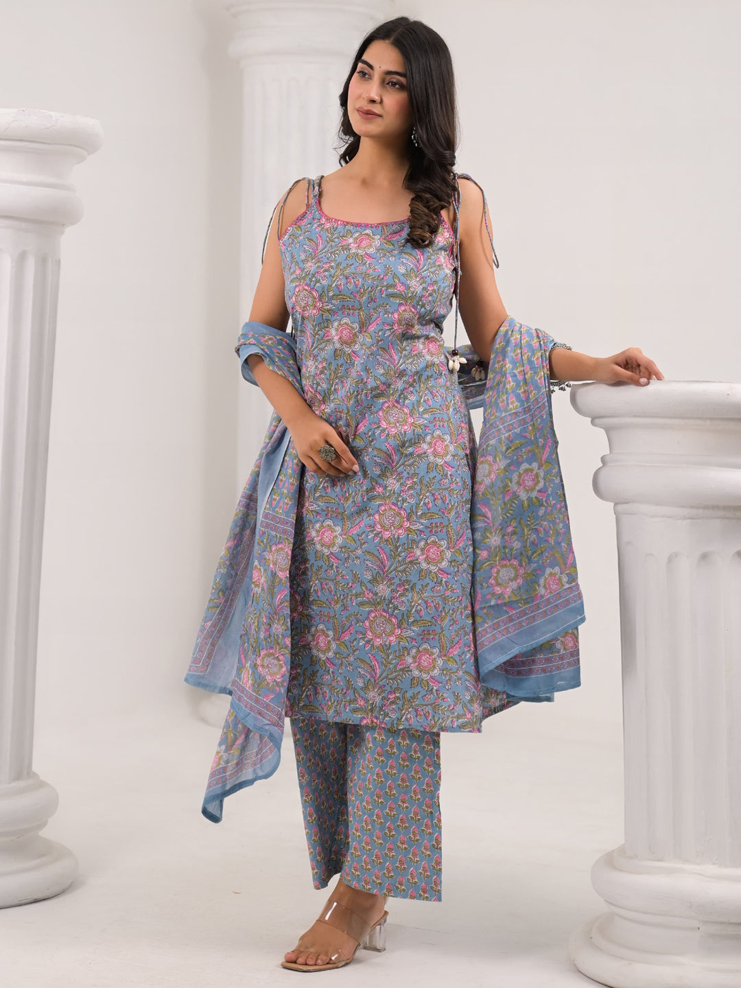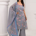 Straight Style Cotton Fabric Grey Color Kurta And Bottom With Dupatta