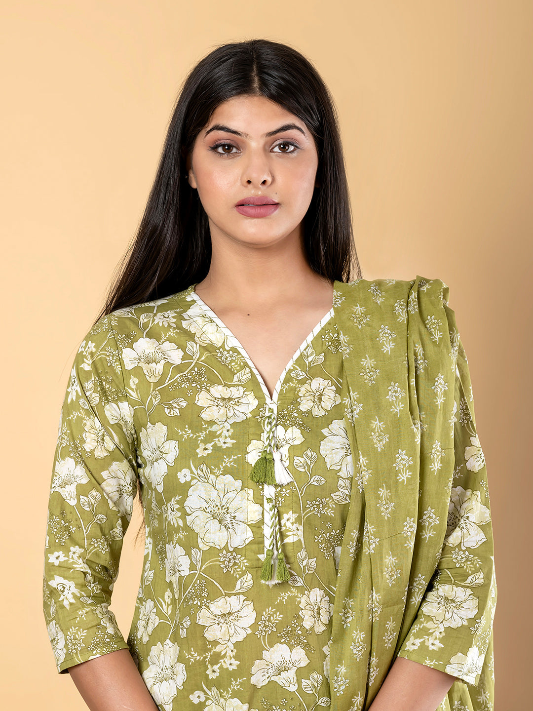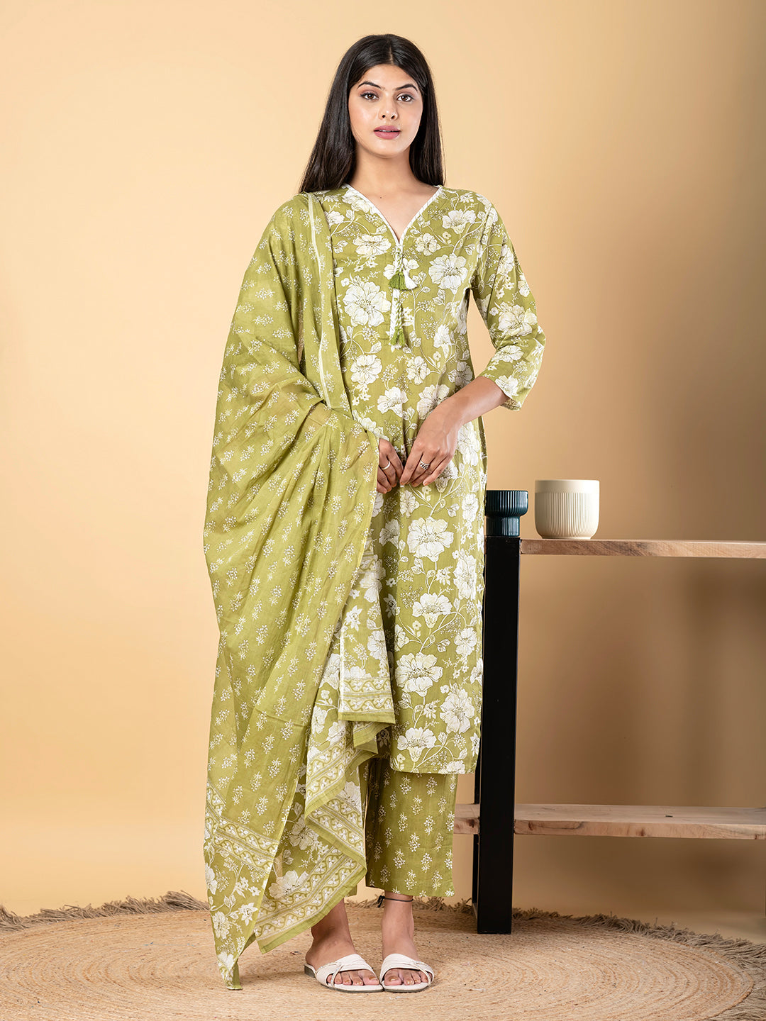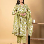Straight Style Cotton Fabric Green Color Kurta And Bottom With Dupatta