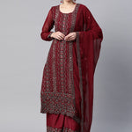 Pakistani Style Georgette Fabric Maroon Color Kurti With Bottom And Dupatta