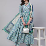 Cotton Calf Length Printed Semi-Flared 3/4 Sleeves V-Neck Kurta Bottom Dupatta Set