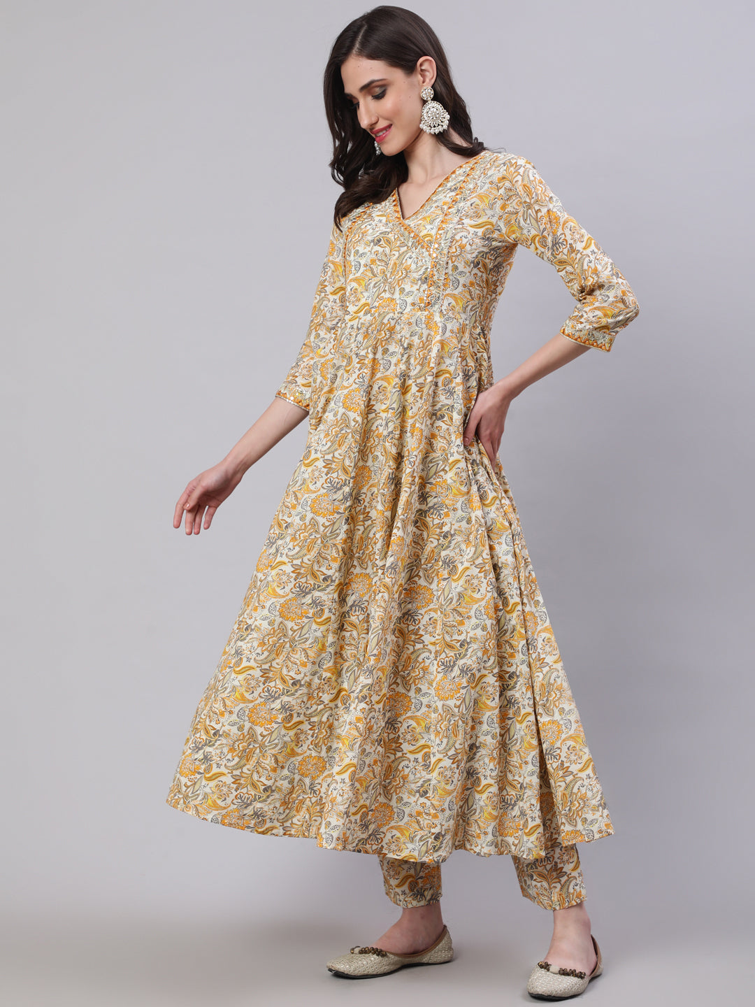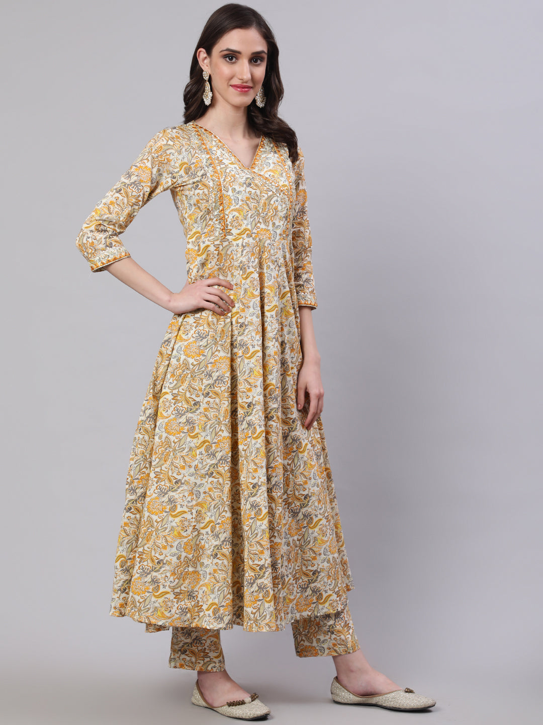 Cotton Calf Length Printed Semi-Flared 3/4 Sleeves V-Neck Kurta Bottom Dupatta Set