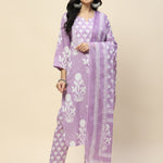 Printed Cotton Straight Kurta Pant With Dupatta Set (Purple)