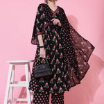 Cotton Calf Length Printed Semi-Flared 3/4 Sleeves V-Neck Kurta Bottom Dupatta Set (Preorder)