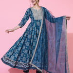 Rayon Calf Length Printed Flared 3/4 Sleeves Round Neck Kurta Bottom Dupatta Set (Preorder)