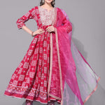 Rayon Calf Length Printed Flared 3/4 Sleeves Round Neck Kurta Bottom Dupatta Set (Preorder)