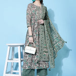 Cotton Calf Length Printed Semi-Flared 3/4 Sleeves Round Neck Kurta Bottom Dupatta Set (Preorder)
