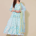 Rayon Calf Length Printed Flared 3/4 Sleeves Round Neck Kurta Bottom Dupatta Set (Preorder)