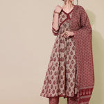 Cotton Calf Length Printed Semi-Flared 3/4 Sleeves V-Neck Kurta Bottom Dupatta Set (Preorder)