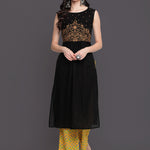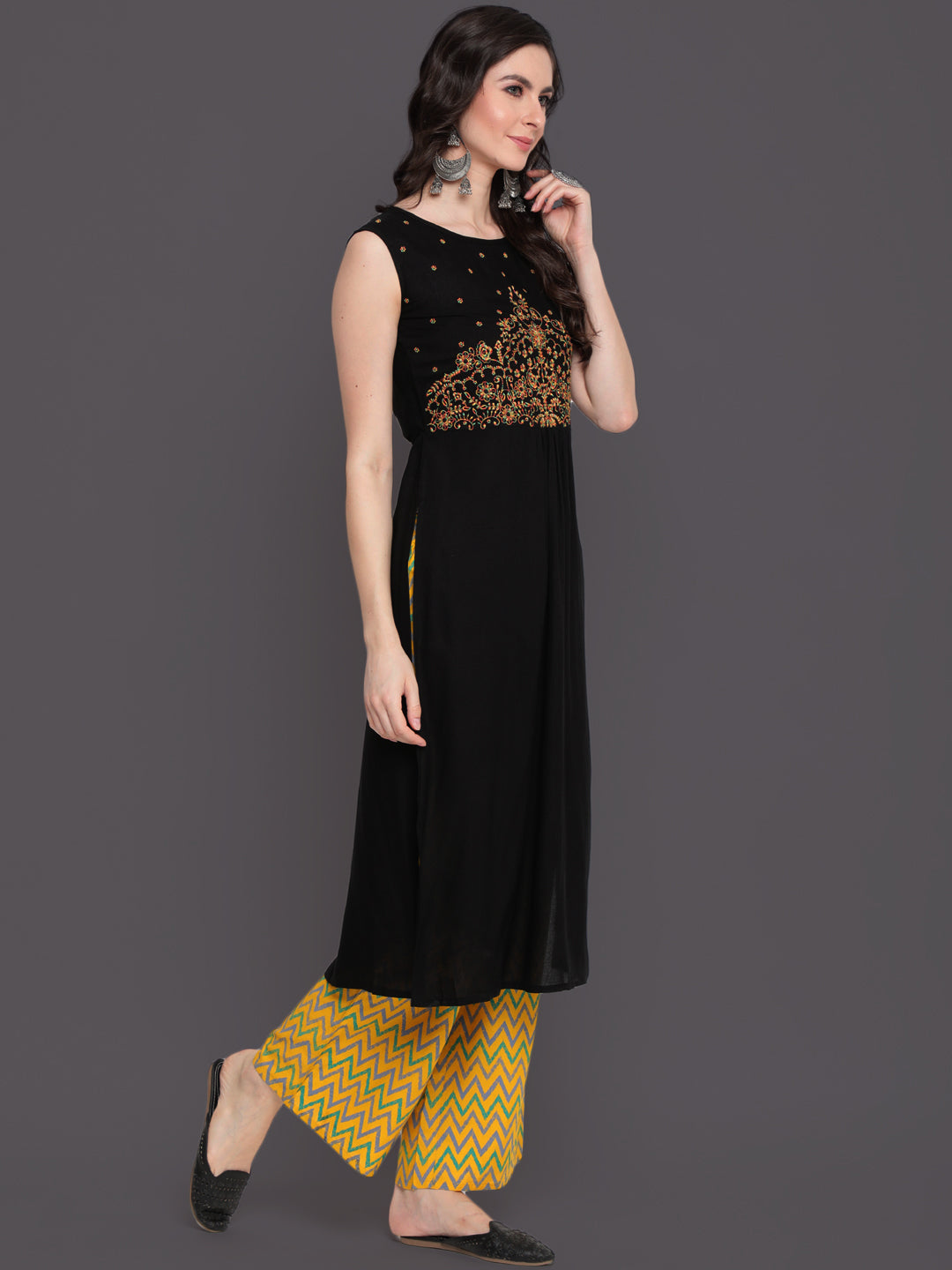Embroidered Semi Flared Calf Length Sleeveless round Neck Rayon Kurta & Palazzo (Preorder)