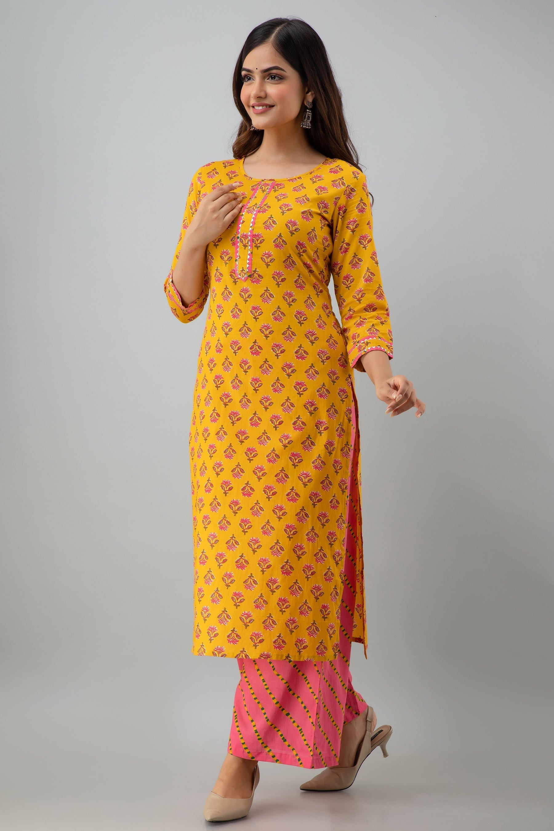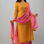 Printed Straight Calf Length 3/4 Sleeves Round Neck Cotton Kurta Dupatta Bottom Set (Preorder)