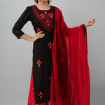 Embroidered Straight Calf Length 3/4 Sleeves Keyhole Neck Rayon Kurta Dupatta Bottom Set (Preorder)