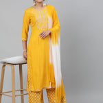 Rayon Slub Embroidered 3/4 Sleeve Straight Round Neck Calf Length Kurta Set (Preorder)