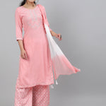 Rayon Slub Embroidered 3/4 Sleeve Straight Round Neck Calf Length Kurta Set (Preorder)