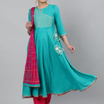 Rayon Embroidered 3/4 Sleeve Flared Round Neck Calf Length Kurta With Dupatta (Preorder)