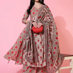 Cotton Calf Length Semi Flared 3/4 Sleeves Printed V-Neck Kurta Bottom Dupatta Set (Preorder)