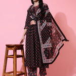 Cotton Calf Length Semi Flared 3/4 Sleeves Printed Round Neck Kurta Bottom Dupatta Set (Preorder)