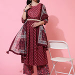 Cotton Calf Length Semi Flared 3/4 Sleeves Printed Round Neck Kurta Bottom Dupatta Set (Preorder)