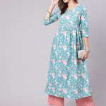 Cotton Calf Length Printed Semi Flared 3/4 Sleeve Round Neck Kurta Bottom Set (Preorder)
